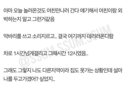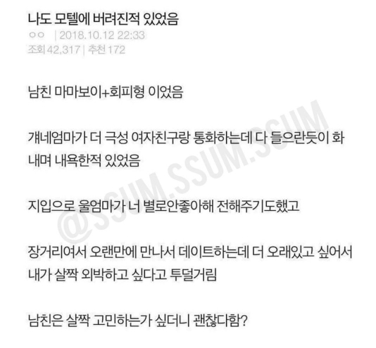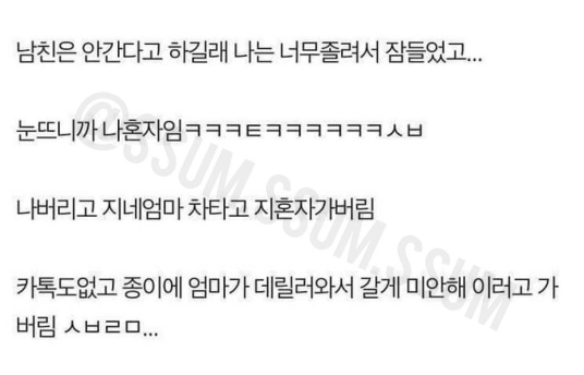 그래서 나도 집에 아빠 혼자 계셔서 마음아프니까 우리아빠랑 같이 데이트하자 했더니 다신 그 말 안하더라 ㅋㅋ 헤어질때도 사귀는 몇년 내내 저러는거 + 나 싫어하는거 존나 티내는게 짜증나서 마마보이라 했더니 급발진하면서 헤어짐ㅋㅋㅋㅋㅋ -