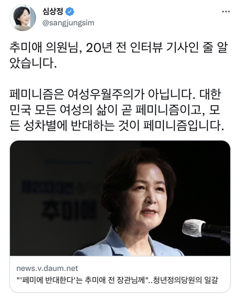 내 생각에 심상정 후보님은 지금 현실에서 피해 입은 여성들에 이입하신거 같고, 추미애 후보님은 더 이상 미러링에 기반한 혐오적인 페미니즘을 그만해야한다고 생각하신거 같아.
