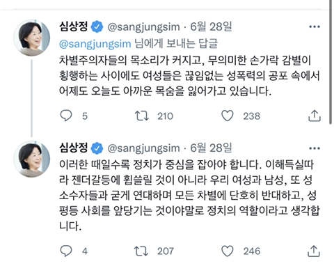 사실 페미인 사람 중 누가 꽃처럼 대접 받길 원하는지 나는 잘 모르겠지만…. 이 발언을 들은 심상정 후보는 이에 반박 하는 내용을 트위터에 올렸음.