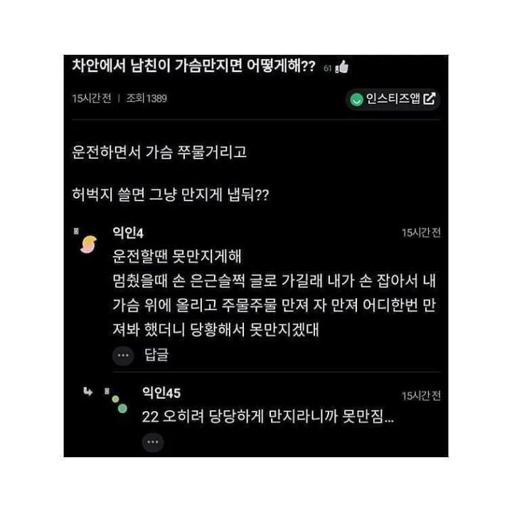 [흥미돋]차 안에서 남친이 가슴 만지면 어떻게 해? 작성자( 본인 닉네임)|작성시간21.10.12|조회수34,561 목록 댓글 125 글자크기 작게가 글자크기 크게가 출처 : 여성시대 ( 본인 닉네임)실제로 많더라... 다음검색 현재 게시글 추가 기능 열기 북마크 공유하기 신고 센터로 신고 댓글 댓글 125 댓글쓰기 답글쓰기 댓글 리스트 작성자동표청년 | 작성시간 23.01.14 헐... 업소사람 대하는거같아... 너무 충격적 작성자현아잉 | 작성시간 23.01.14 윽 작성자아기홀앵희 | 작성시간 23.01.14 아니 그보다 일단 사고난다..운전 집중혀ㅜㅜ 작성자she/her | 작성시간 23.01.15 ㅅㅂ내가 멀 읽은걸까? 작성자노는강쥐 | 작성시간 23.01.15 댓글 전체보기