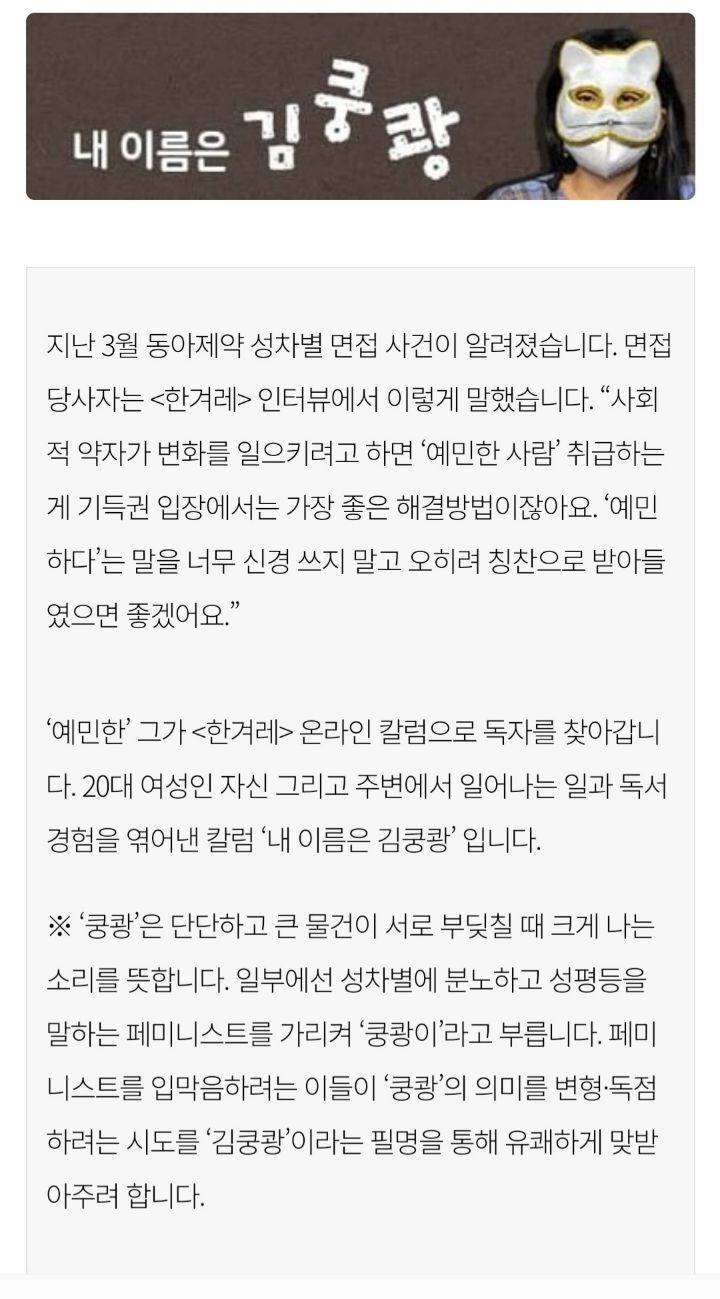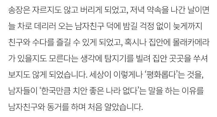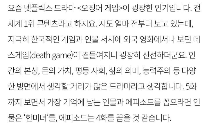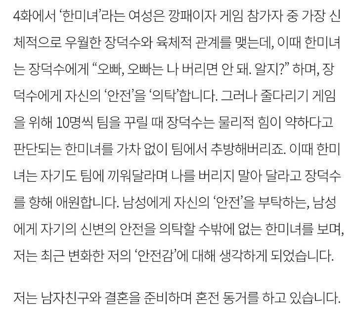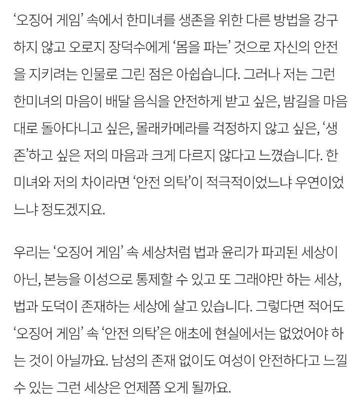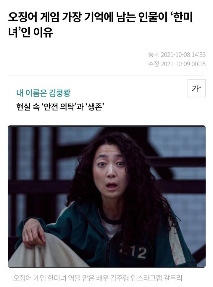 [여시뉴스데스크]오징어 게임 가장 기억에 남는 인물이 ‘한미녀’인 이유 (내용스포O) 작성자나는야케첩될거야|작성시간21.10.14|조회수11,178 목록 댓글 14 글자크기 작게가 글자크기 크게가 출처 : https://m.hani.co.kr/arti/society/women/1014456.html오징어 게임 가장 기억에 남는 인물이 ‘한미녀’인 이유내 이름은 김쿵쾅현실 속 ‘안전 의탁’과 ‘생존’www.hani.co.kr전문은 출처 클릭 다음검색 현재 게시글 추가 기능 열기 북마크 공유하기 신고 센터로 신고 댓글 댓글 14 댓글쓰기 답글쓰기 댓글 리스트 답댓글 작성자컨텍스트 | 작성시간 21.10.14 22 완전 동의 답댓글 작성자Mr.taxi | 작성시간 21.10.14 33333 답댓글 작성자얌얌깔깔 | 작성시간 21.10.14 4 삭제된 댓글입니다. 답댓글 작성자성경불경갓연경 | 작성시간 21.10.17 그르니까 그게 젤 아쉬움 댓글 전체보기
