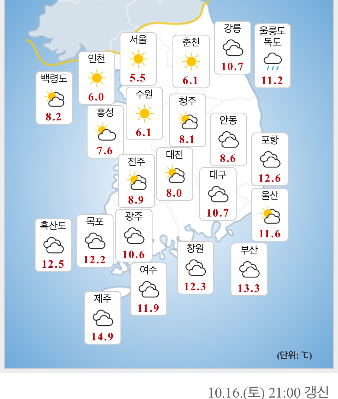 [흥미돋]현재 전국 기온 작성자X file|작성시간21.10.16|조회수9,353 목록 댓글 36 글자크기 작게가 글자크기 크게가 출처 : 여성시대 X filehttps://www.weather.go.kr/w/index.do#toggle기상청 날씨누리기상청 날씨누리www.weather.go.kr16일 밤 9시 다음검색 현재 게시글 추가 기능 열기 북마크 공유하기 신고 센터로 신고 댓글 댓글 36 댓글쓰기 답글쓰기 댓글 리스트 작성자셜록홀즈 | 작성시간 21.10.16 뭐노 작성자김진혁씨 | 작성시간 21.10.16 진시 오늘 추워 뒤지는줄 작성자고양이최고울트라슈퍼캡짱 | 작성시간 21.10.16 아 서울 ㄹㅇ 진짜 손 시랴워 죽는줄 작성자연봉아올라라 | 작성시간 21.10.16 아니 아직 은행나무도 초록색이라그어ㅏ!!!!!! 작성자ㅇㅓ떻게알앟쥐..ㅈ | 작성시간 21.10.17 코트 입어야돼.... 댓글 전체보기