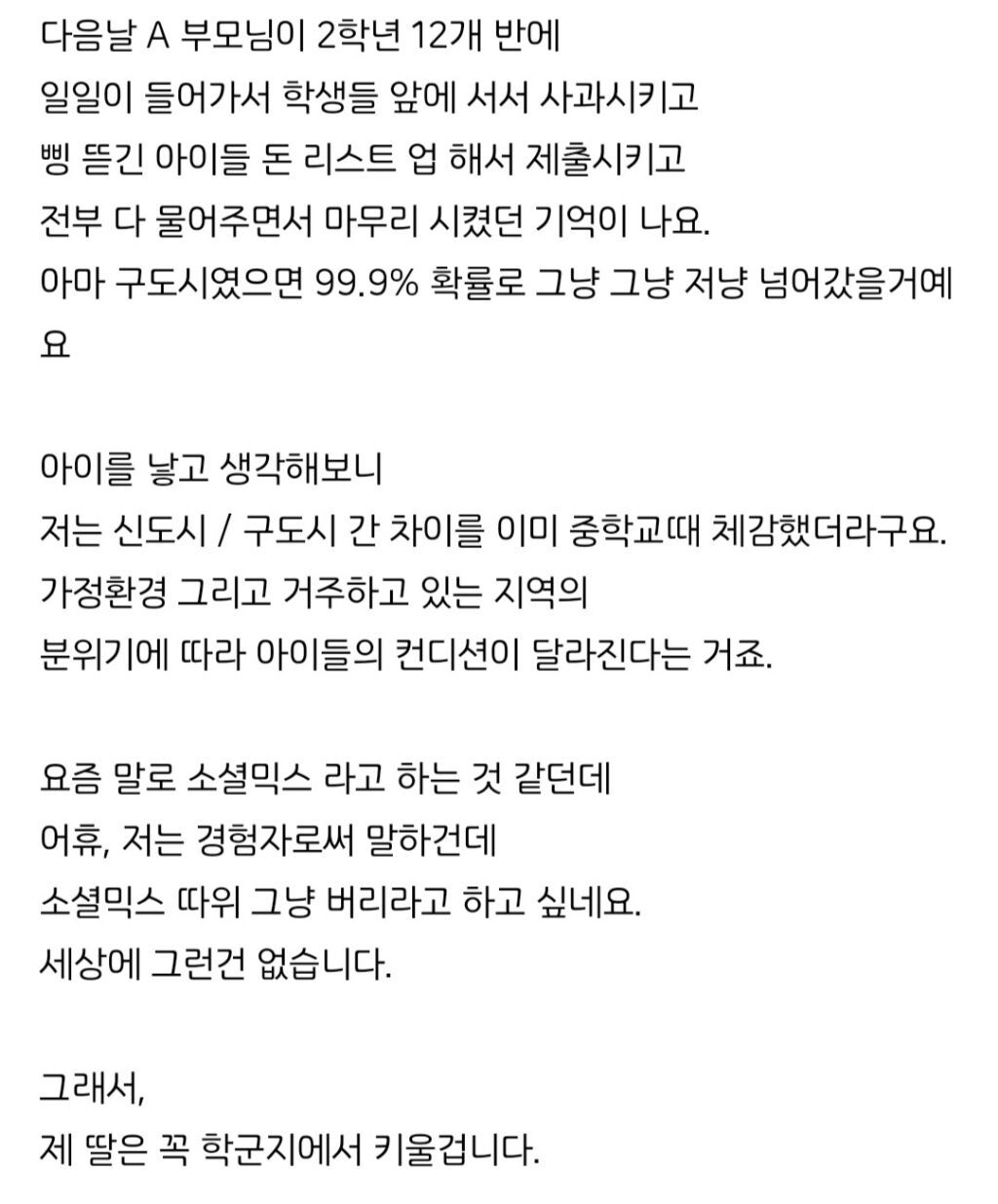 작성자어쩌라고으뱌뱌 작성시간 21.10.18 솔직히 최상위권대학가려면 학군좋은데 가는것보다 수준낮은 고등학교가서 뱀의 머리가 되는게 나아~ 그럼에도 둘다 다녀본 나로써는 무조건 내자식은 학군따라갈거야 성적 공부가 중요한게 아니고 같이노는 애들의 수준 일탈의 정도가 아예 다름..... 가난혐오라고 할수있겠지만 부모가 제대로 케어 안해주는 동네 애들 수준은 상상을 초월해