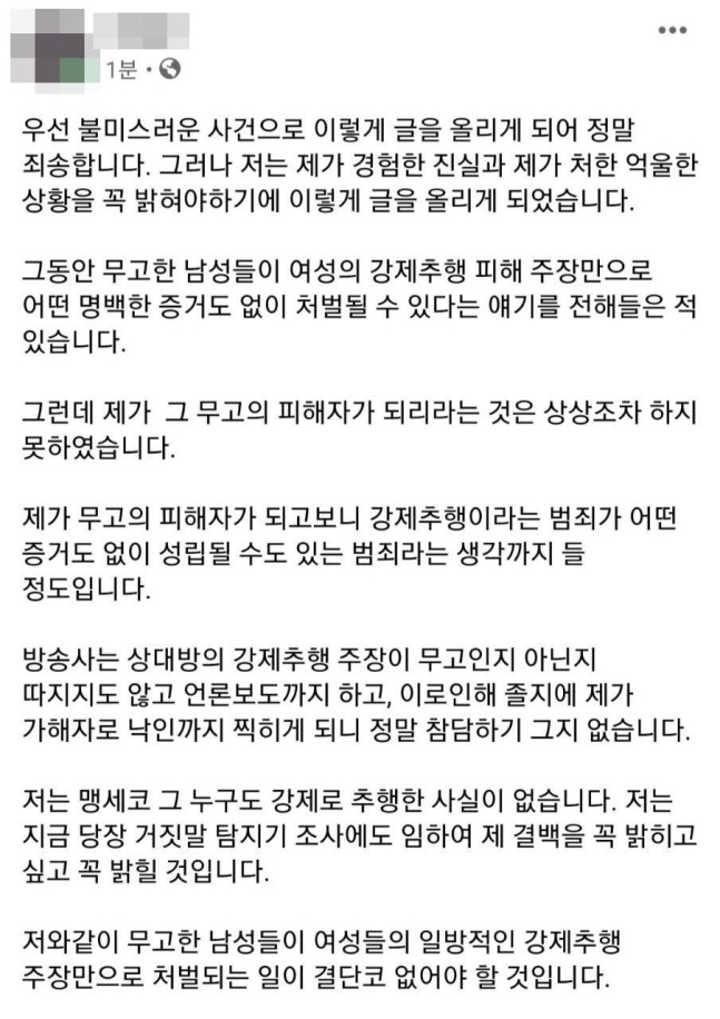 성폭력 의혹이 불거진 20 대 청년단체 대표 A씨가 무고의 피해자라고 주장한 글. 현재는 삭제된 상태다. /페이스북