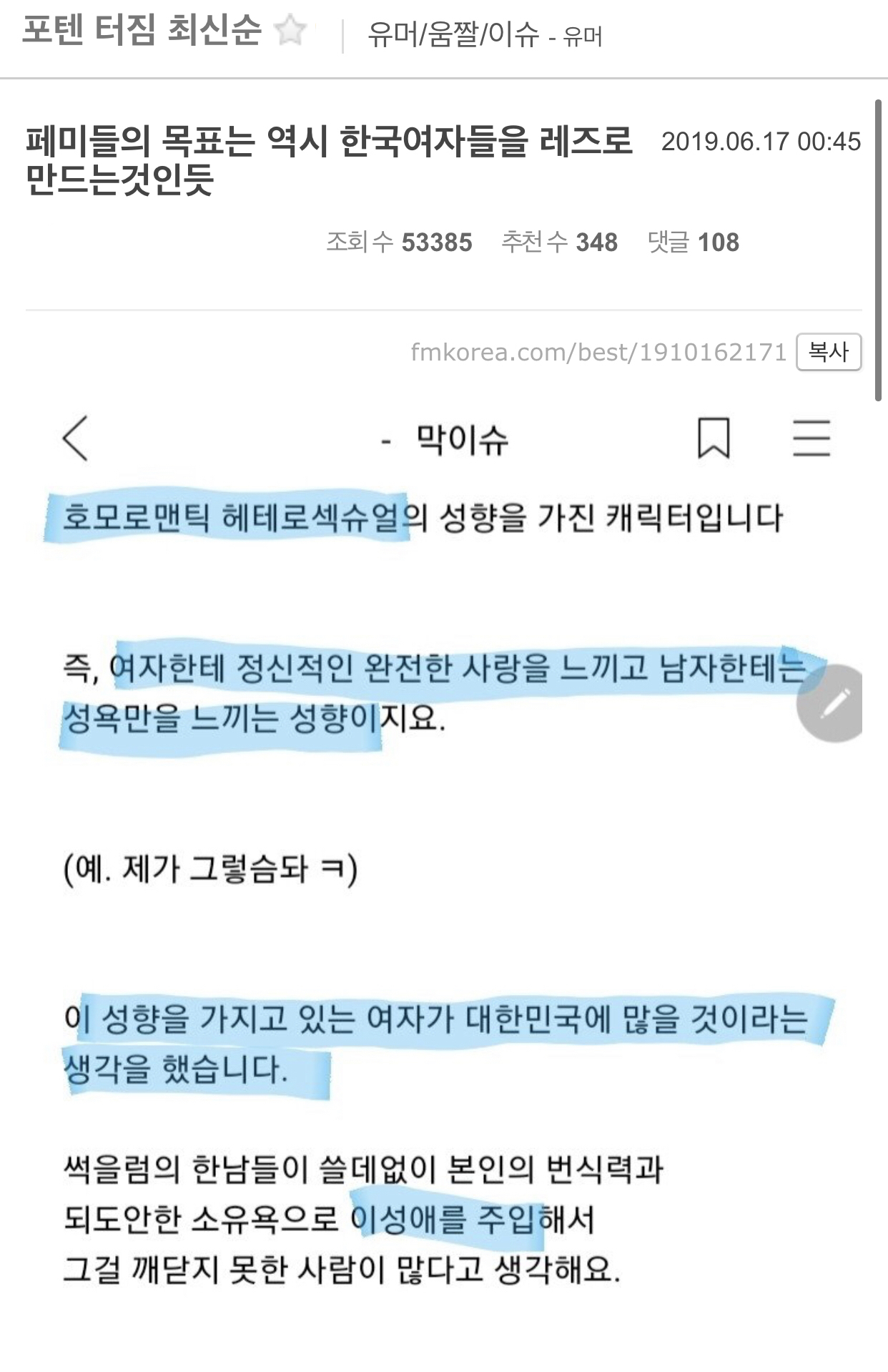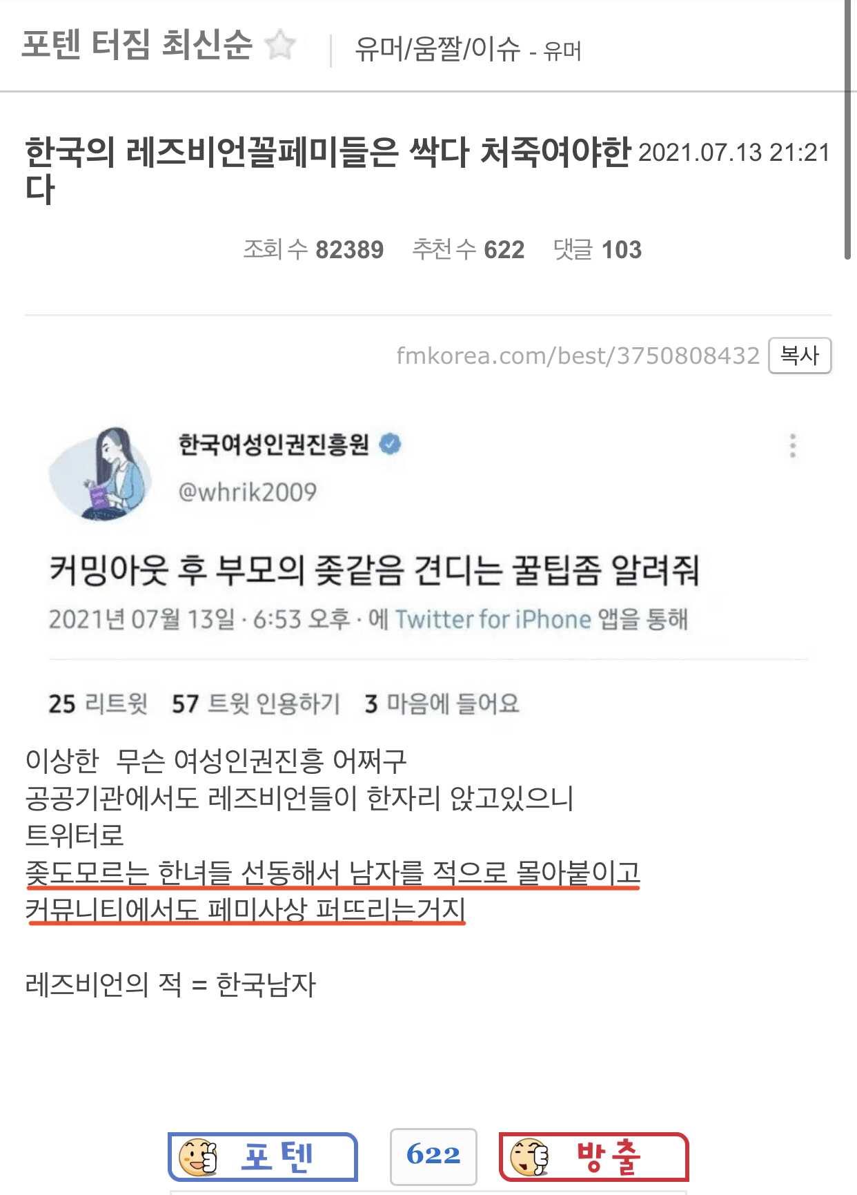 작성자율나락 작성시간 21.10.23 야이앀ㅋㅋㅋㅋㅋㅋㅋㅋㅋ한남충은 걍 세계적 찐따샠기들이야.. 너네 안좋아한다고 동성애자가 되진 않앜ㅋㅋㅋㅋㅋㅋㅋㅋㅋㅋㅋㅋ니새끼들 말고 세상에 사랑할게 많거든ㅋㅋㅋㅋㅋㅋㅋㅋㅋㅋㅋㅋㅋ