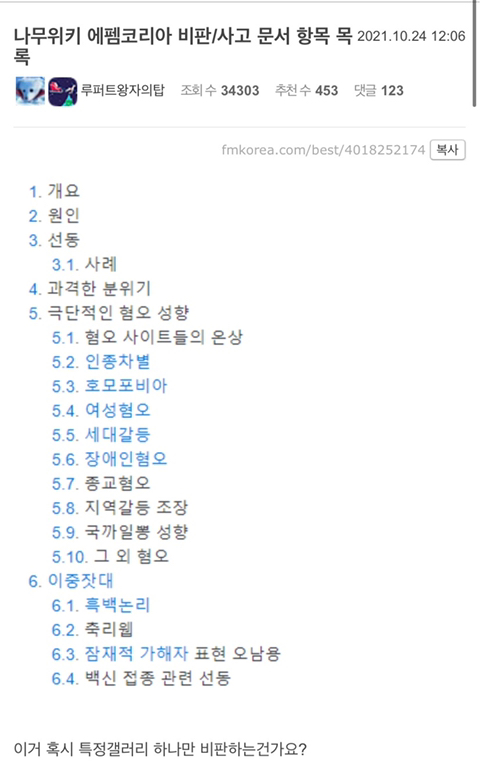 [기타]나무위키 에펨코리아 비판/사고 문서 항목 목록 작성자(본인 닉|작성시간21.10.24|조회수2,193 목록 댓글 5 글자크기 작게가 글자크기 크게가 출처 : 여성시대 (본인 닉https://m.fmkorea.com/best/4018252174나무위키 에펨코리아 비판/사고 문서 항목 목록이거 혹시 특정갤러리 하나만 비판하는건가요?www.fmkorea.com 다음검색 현재 게시글 추가 기능 열기 북마크 공유하기 신고 센터로 신고 댓글 댓글 5 댓글쓰기 답글쓰기 댓글 리스트 작성자으아라라 | 작성시간 21.10.24 꼬리자르기 오지노 ㅋㅋㅋ 작성자Saturnus | 작성시간 21.10.24 쟤들은 소수가 저러고 다수는 정상이라고 망상하더라고 답댓글 작성자yaaaaaas | 작성시간 21.10.24 22 정화작용 잘되는 사이트라 생각함 <ㄹㅇ 현실서본 펨코남이 한말 작성자처치댄스홀처치는교회다 | 작성시간 21.10.24 니네얘기야; 작성자남자는죽은채발견되었다 | 작성시간 21.10.24 펨베 댓글 전체보기