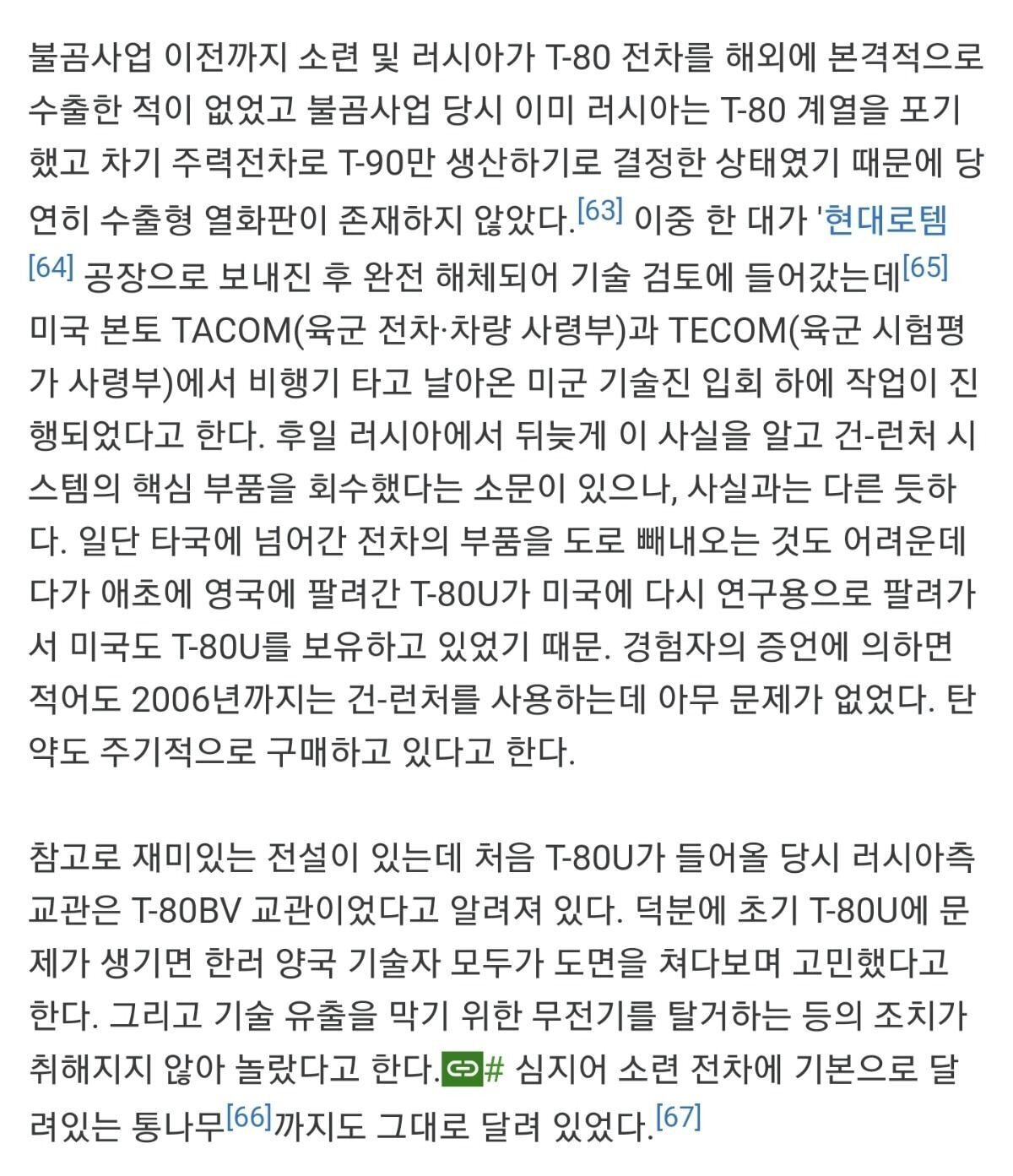 심지어 러시아는 T-80 탱크 교관과 설계도도 보내서 우리 기술자들에게 노하우를 전수하고, 탱크에 문제가 생기면 우리 기술자들과 같이 도면 쳐다보면서 고민했다고 함.