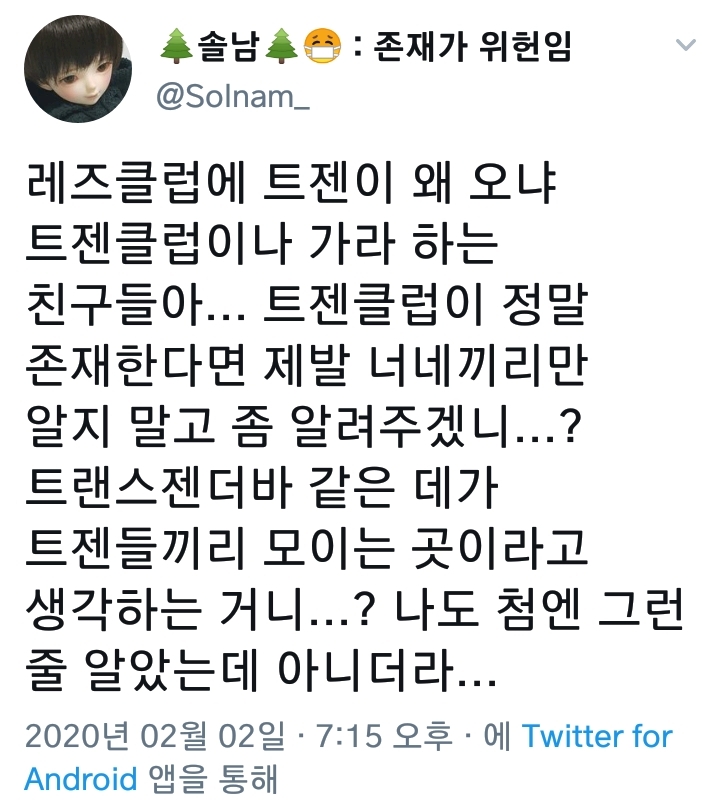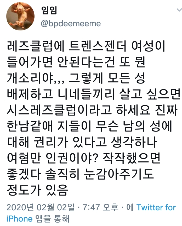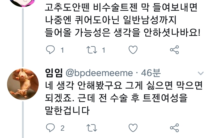 비수술 트젠남이 레즈클럽 들어가려고 해서 시끄러운데 그건 생각 안해봤다고 함