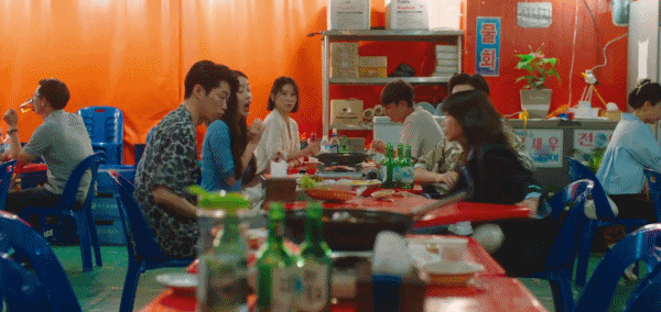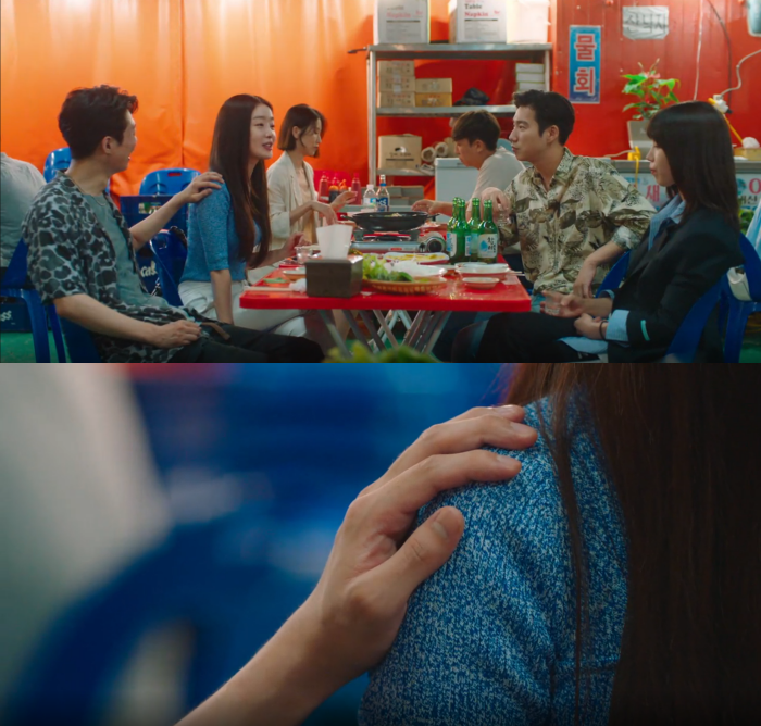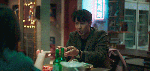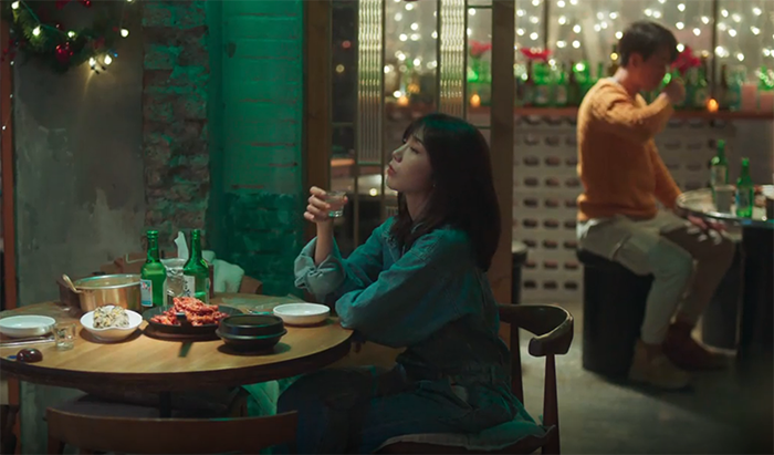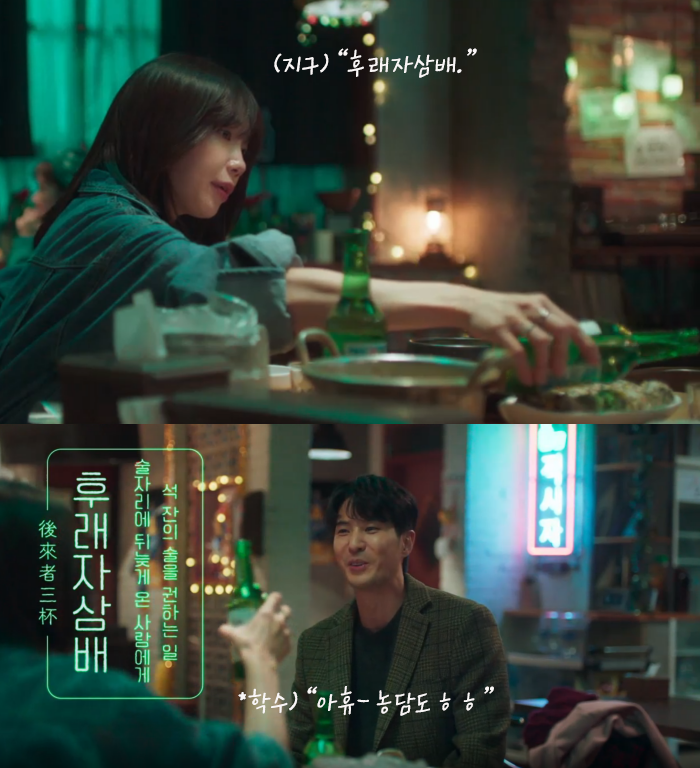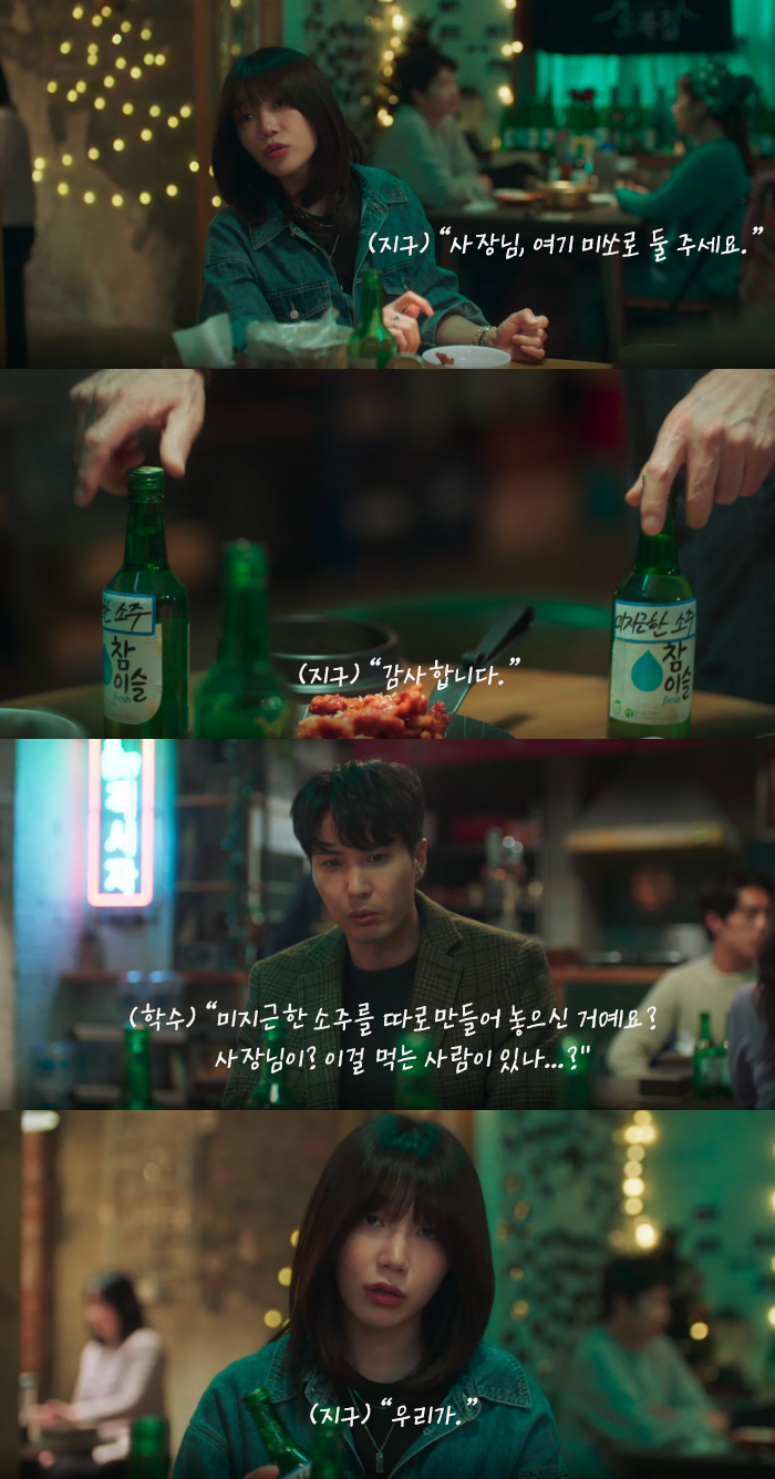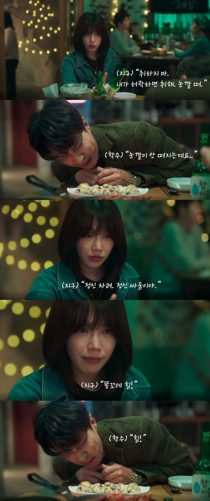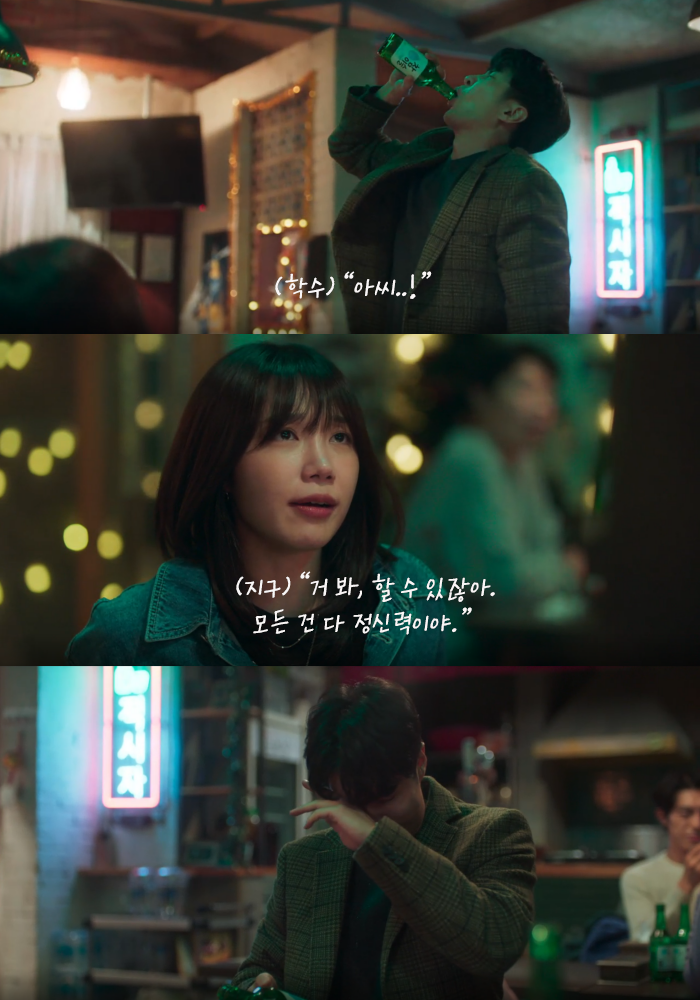 (얼굴에 흘린 소주인지 눈물인지 닦는 중)