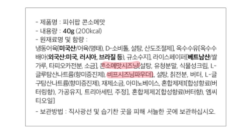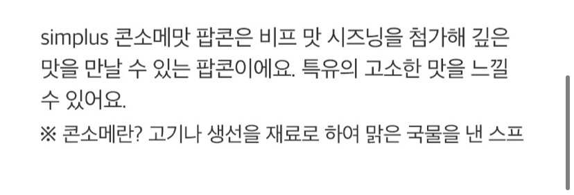 아마 콘소메맛 ‘팝콘’이 ‘콘소메’보다 더 유명해서 팝콘(옥수수맛)으로 잘못 인식된 것 같음 .. 콘소메의 콘이 corn이 아니랍니다.. 아 그리고 가끔 일본어(?)로 오해하는 사람도 있는데 프랑스어임ㅋㅋㅋ
