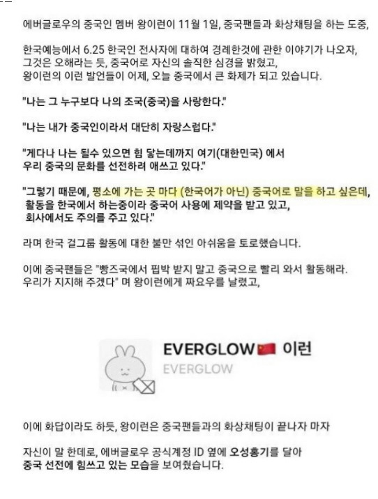 그리고 에버글로우의 왕이런은 한국에서 활동하면서 중국을 선전하겠다고 당당하게 한국에서 말했지