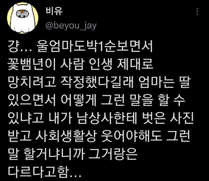 박원순 때도 김선호 때도 여자가 꽃뱀아니냐고 돈뜯어내려고 그런 거 아니냐해서 내가 존나 느갭고함지르면서 내가그여자였어도그랬을거냐고 함 그럼 조용해져... 언젠간 아빠도 엄마처럼 바뀌었으면 좋겠지만... 힘들듯 -