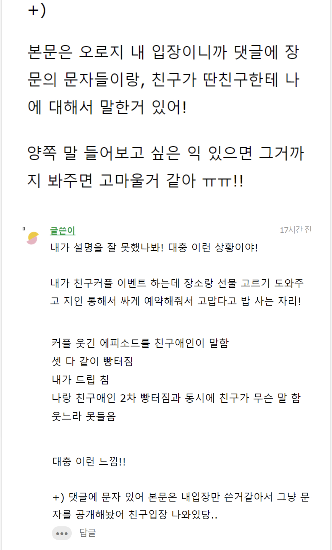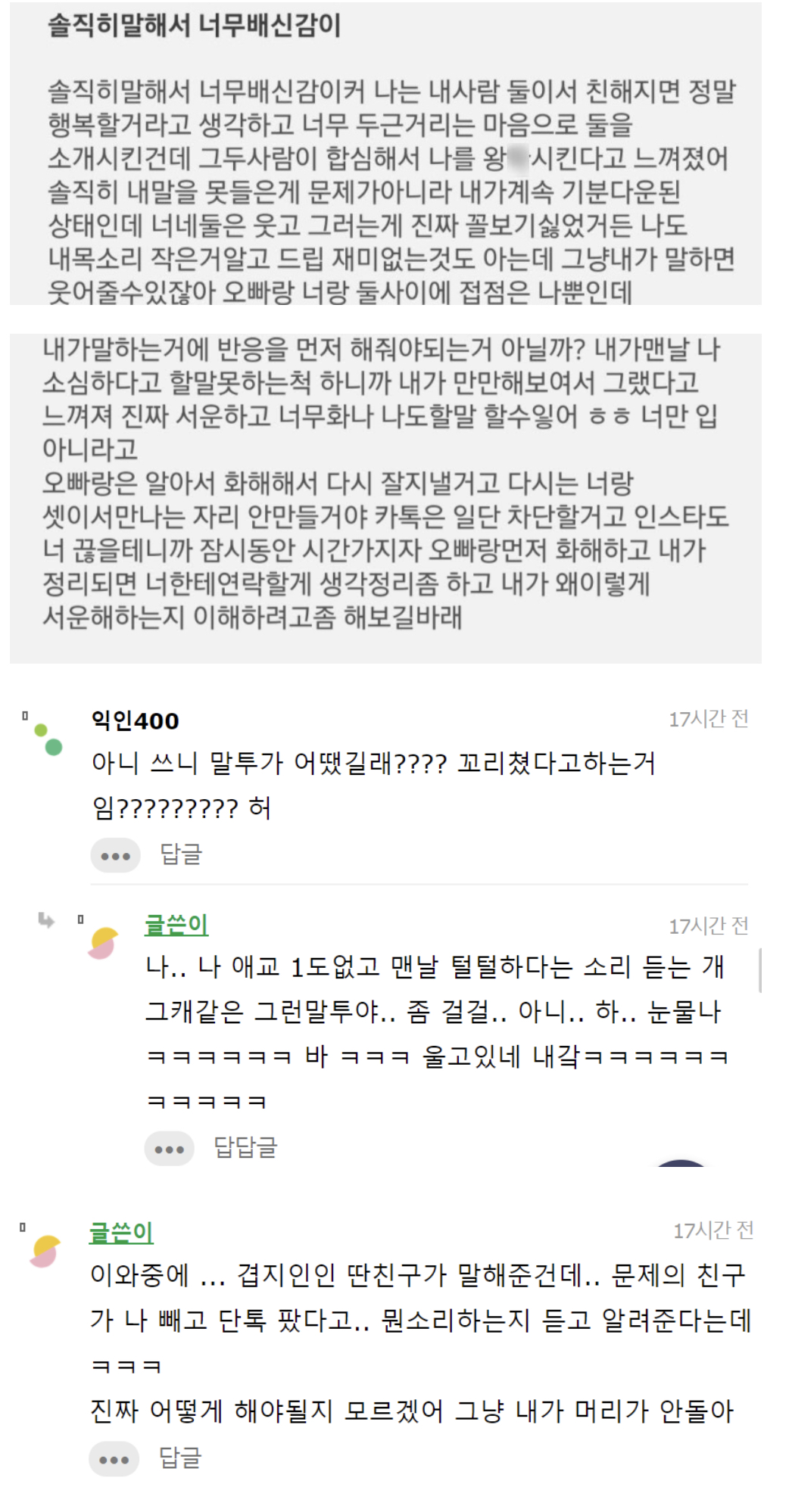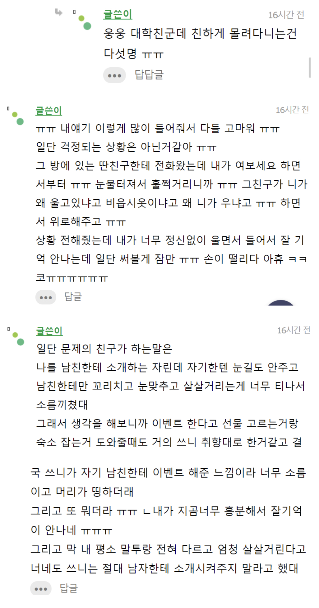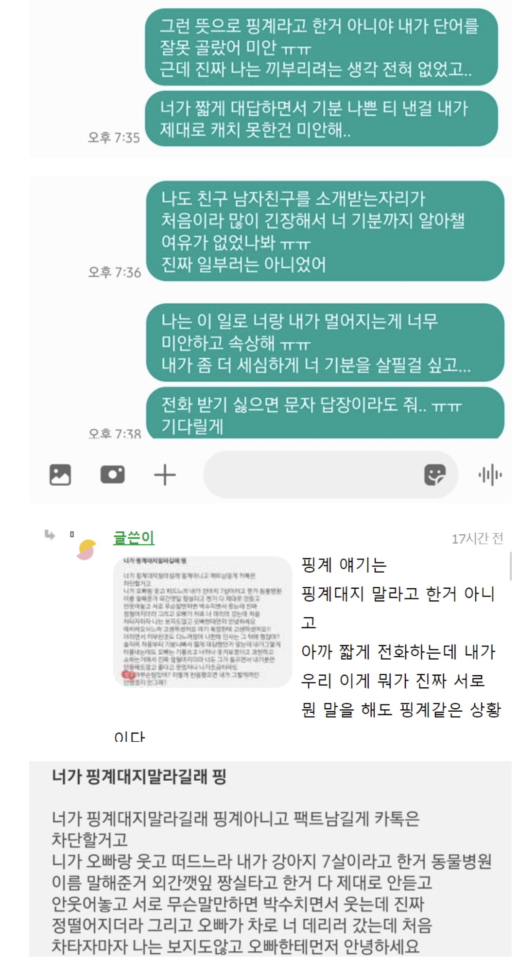 작성자오뚜기스낵면 작성시간 21.11.30 와 나는 글쓴이랑 반대입장이었는데 전남자친구가 지 친구 소개시켜주는 자리였거든 근데 지 소외된 느낌이라고 겁나 화냈는데 생각해보니까 전남친 열등감 오졌었음