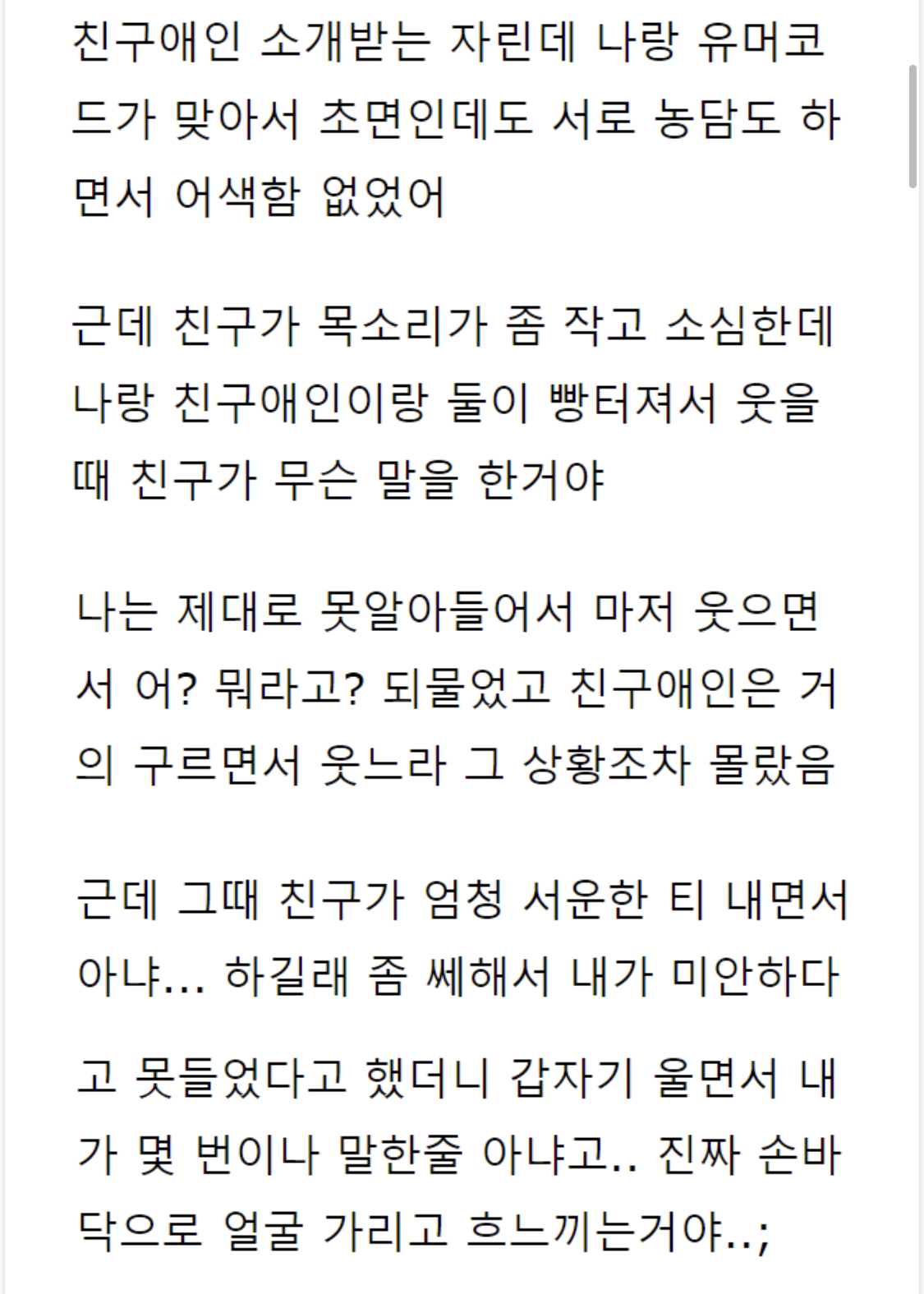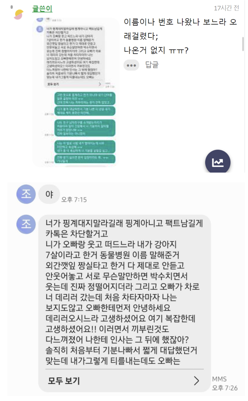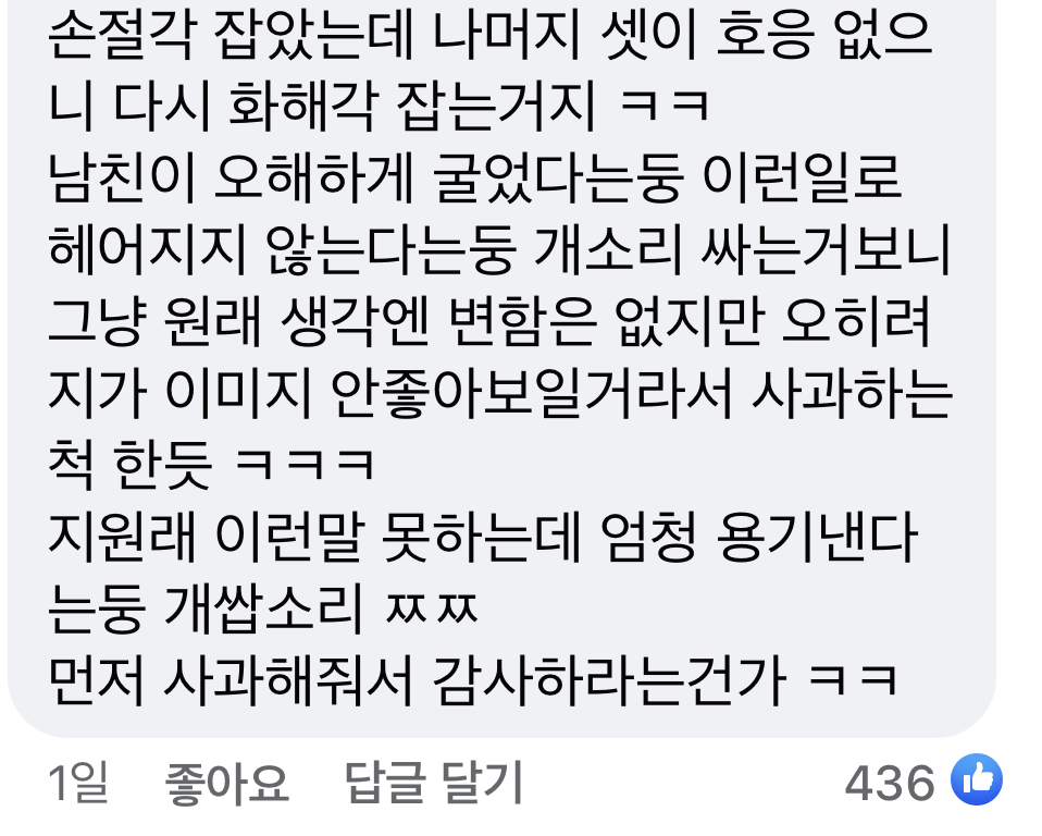 작성자토구마 작성시간 21.12.01 대박이다 그 와중에 너가 오해하게끄름 이런 워딩쓰는거 ㅋㅋ 결국 저 글쓴이가 지 남친한테 꼬리쳤다고 생각하는건 변함 없다는거잖아