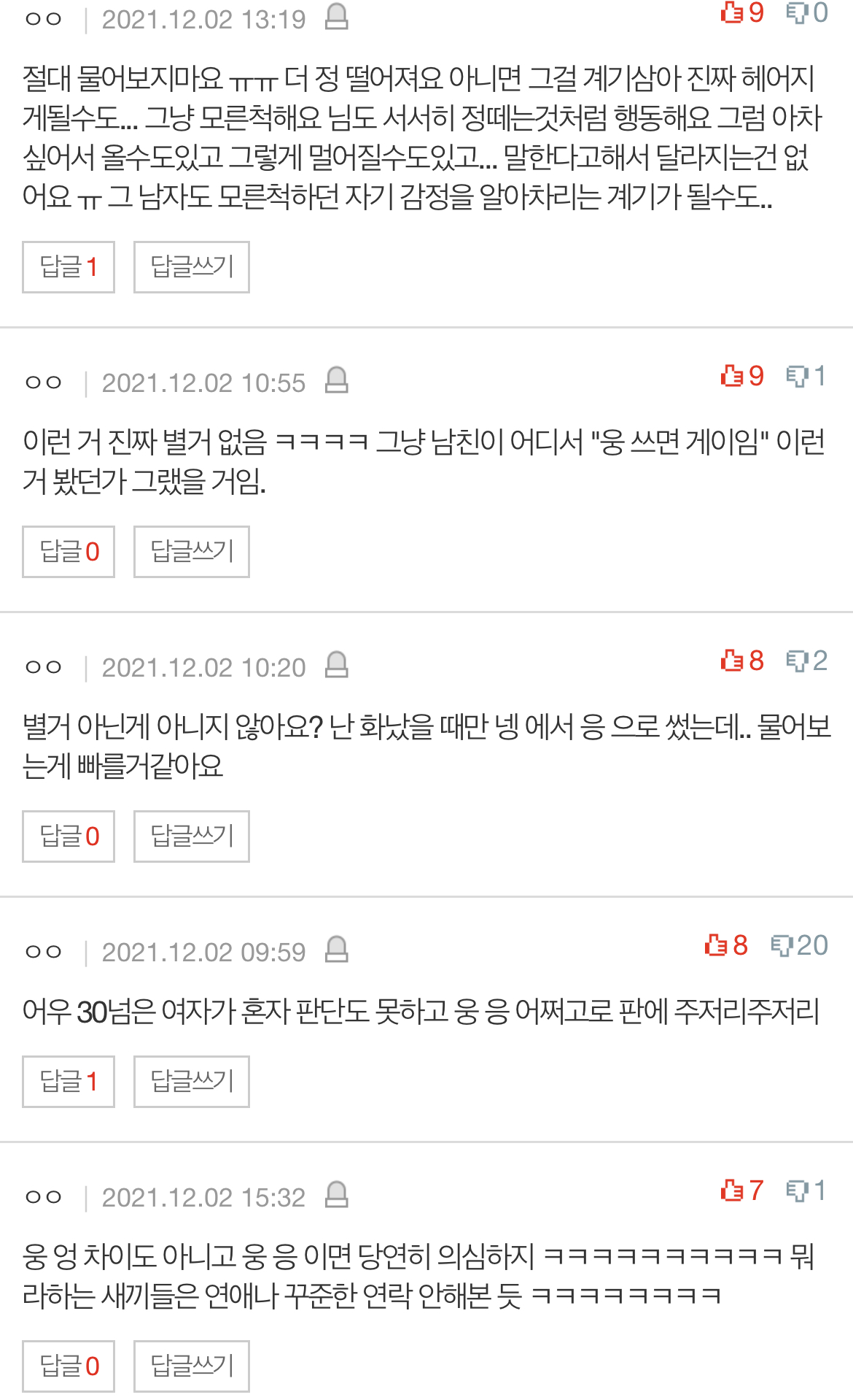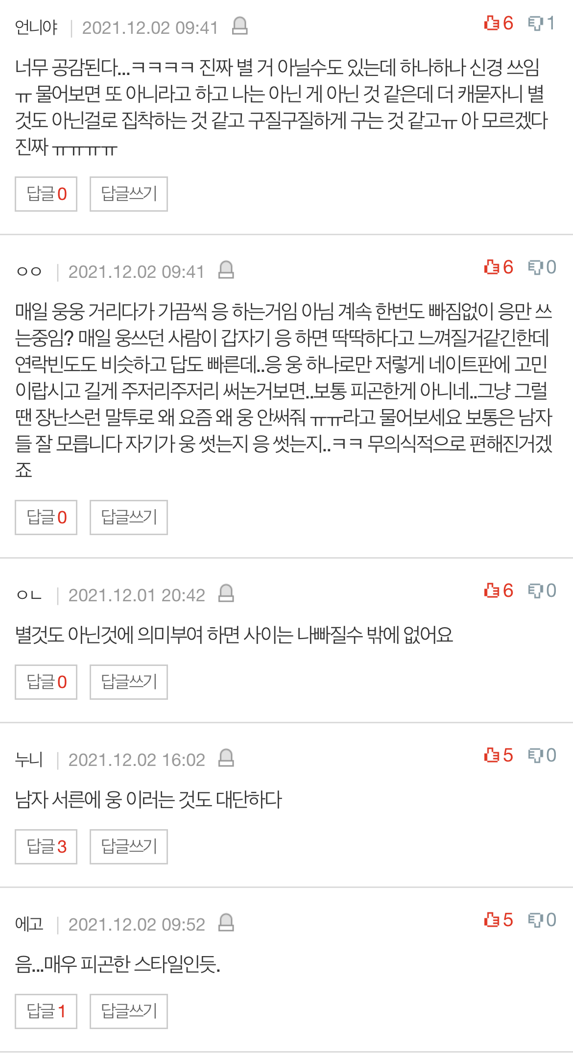 근데 지금 그 말투 빼고는연락 빈도도 비슷하고 답도 빠른 편인데..아무래도 '응'은 좀.. 뭔가 있는 거 같지 않나요그냥 형식적으로 카톡하는 건가..