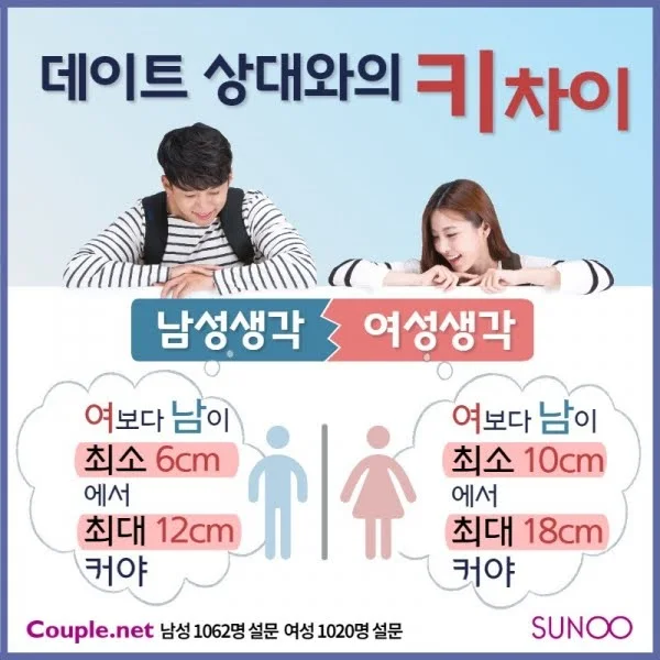 남성이 생각하는 남녀의 키 차이는 남성이 여성보다 최소 6cm에서 최대 12cm 더 큰 게 좋다고 답했고, 여성은 남성이 여성보다 최소 10cm에서 최대 18cm 더 커야 한다고 답했다.