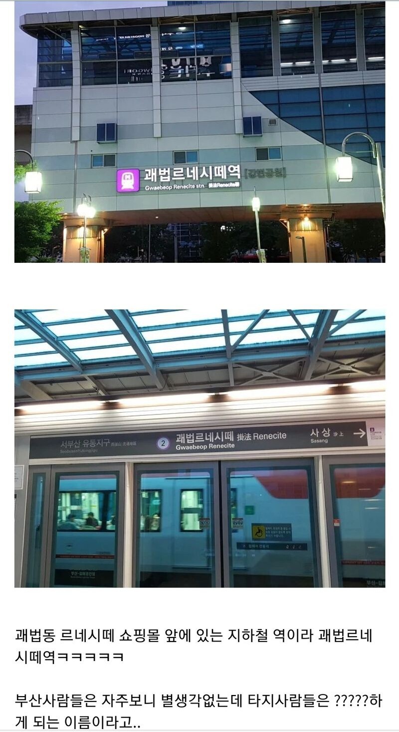 [흥미돋]부산 사람 외 모두 당황하는 역 이름 작성자나문희준|작성시간21.12.10|조회수125,078 목록 댓글 44 글자크기 작게가 글자크기 크게가 출처 :https://www.dmitory.com/issue/219297095 다음검색 현재 게시글 추가 기능 열기 북마크 공유하기 신고 센터로 신고 댓글 댓글 44 댓글쓰기 답글쓰기 댓글 리스트 작성자뚀잉뚀잉 | 작성시간 21.12.10 처음 봤을때 의아했던 기억은 있어ㅋㅋㄱㅋㅋ 작성자럼플스틸츠킨 | 작성시간 21.12.10 메롱시티같다구여 ...ㅠ 작성자이름만 불러봐도 마음이 벅차요 | 작성시간 21.12.10 르법 괘네시떼! 작성자아이패드프로5갖고싶다 | 작성시간 21.12.10 괘법 특이해~ 작성자미접종자 | 작성시간 21.12.28 괘르 법네시떼 댓글 전체보기