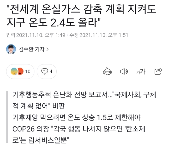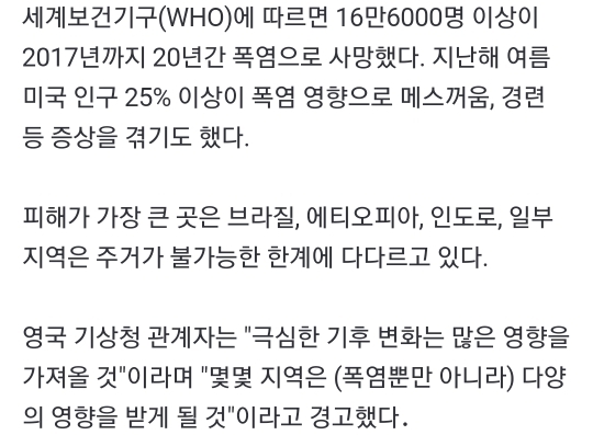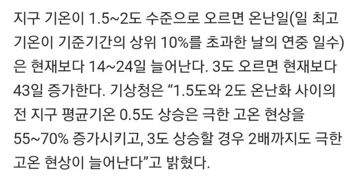 캡쳐는 없지만 내가 본 기사에서는 12년안에 지구에서 사람이 살수있는 땅이 절반으로 줄어든다고 했어. 기온상승으로 인한 사막화또한 거주지축소의 원인임