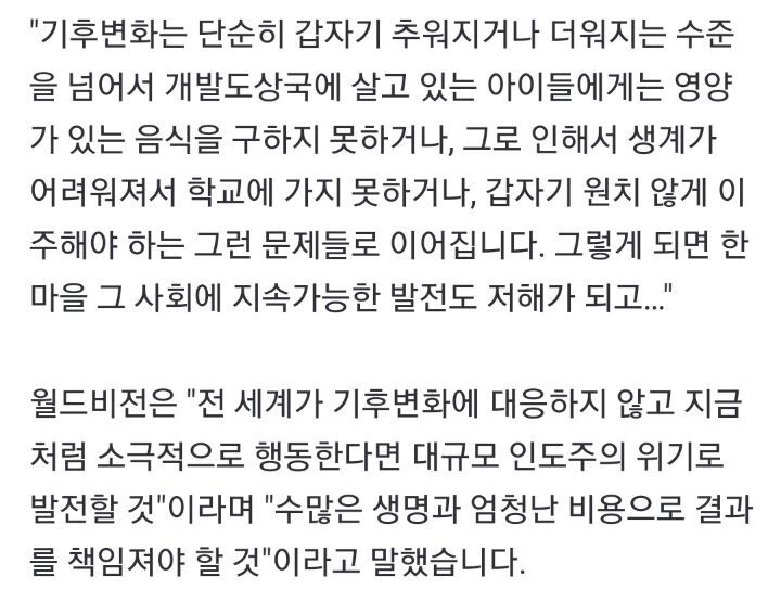 개발도상국들은 이미 기후변화로 인한 식량난을 겪고있음. 미래의 일이 아님. 지구의 현실임.