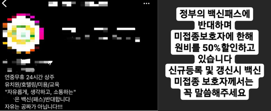이와 관련 애견유치원 관계자는 JTBC와의 통화에서 "백신 미접종자들을 대상으로 한 할인 이벤트를 SNS에서 진행하고 있는 것이 맞다"며 "접종자들도 유치원 출입을 금지하고 있고 자신들의 개를 보내고 싶을 경우 온라인과 전화로 상담을 진행하고 있다"고 말했습니다.