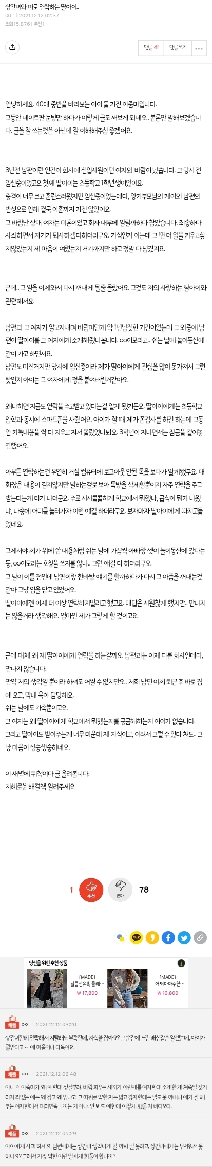 남편한테도 상간녀한테도 말못하고 애한테만.. 만나고있을까봐 그거 확인 사살될까봐 그러는거 아닌가... 그런 상황에서 애도 이 가정이 불안하겠지 -
