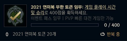 이번에는 승리하면 10토큰, 지면 5토큰을 주는 것이 아닌 점수를 줌. 위의 표가 그 점수의 기준표인데 이제는 이 점수를 400점을 채우면 20토큰씩 주는 쿨타임 없는 무한 반복 퀘스트로 토큰을 얻을 수 있음.