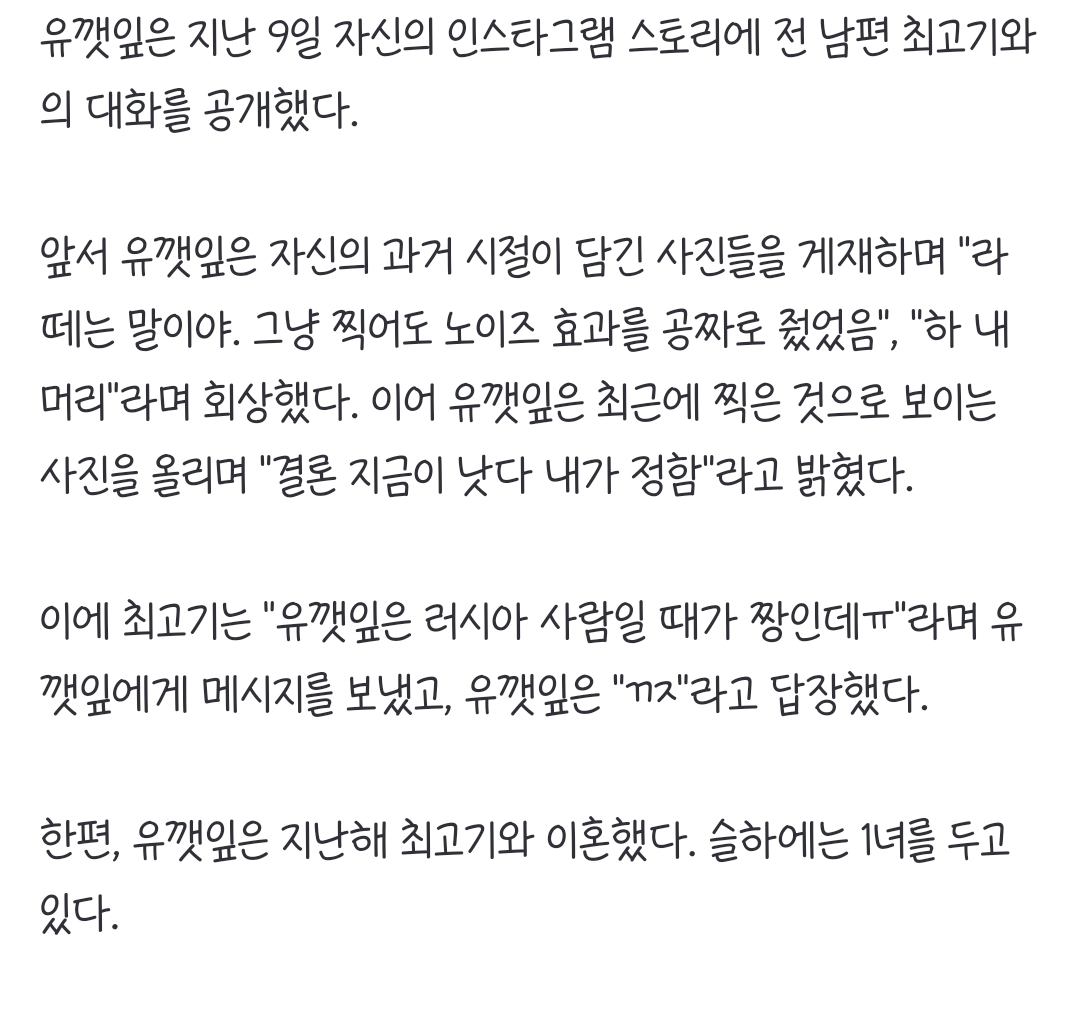 [여시뉴스데스크]유깻잎, 전 남편 최고기에 "꺼져"…무슨 일? 작성자NO:ZE|작성시간21.12.30|조회수19,940 목록 댓글 30 글자크기 작게가 글자크기 크게가 출처 : https://n.news.naver.com/entertain/article/003/0010882369유깻잎, 전 남편 최고기에 "꺼져"…무슨 일?[서울=뉴시스]윤준호 인턴 기자 = 유튜버 유깻잎이 전 남편 최고기의 메시지에 날선(?) 반응을 보였다. 유깻잎은 지난 9일 자신의 인스타그램 스토리에 전 남편 최고기와의 대화를 공개했다. 앞서n.news.naver.com여시들 최고기 현 여자 친구 여시에 있으니까 워딩 조금만 조심...!!현재는 헤어졌대!! 다음검색 현재 게시글 추가 기능 열기 북마크 공유하기 신고 센터로 신고 댓글 댓글 30 댓글쓰기 답글쓰기 댓글 리스트 작성자누룽지맛탕 | 작성시간 21.12.30 실명은 아니지?? 작성자쏜현우 | 작성시간 21.12.30 별거를 다 기사로 내ㅋㄱㄲ 작성자출근과퇴근 | 작성시간 21.12.30 별게다기사가나넼ㅋ 작성자부스스 | 작성시간 21.12.30 뭔말인지 전혀모르겟군 작성자금겟을위한닉변쓰 | 작성시간 22.01.21 ㅋㅋㅋㅋㅋㅋㅋㅋㅋㅋㅋㅋㅋㅋㅋㅋㅋㅋㅋㅋㅋ 댓글 전체보기