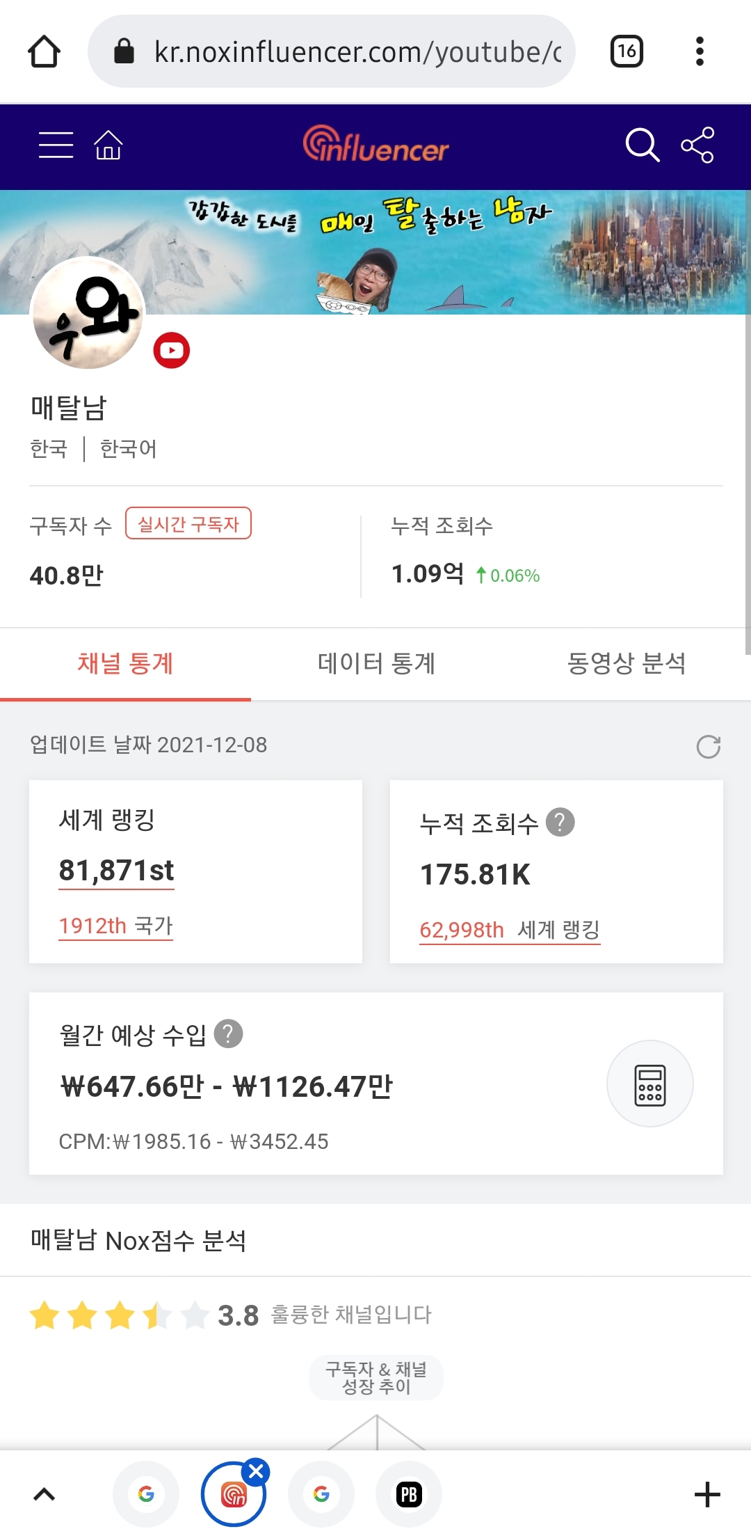 -> 수익구조가 건강해 보이긔 월 수익도 괜찮은 편이고 구독자수 대비 조회수도 잘나오는 편이긔 이대로만 유지된다면 우리 매탈남 영상 오래오래 볼수있을거같긔!