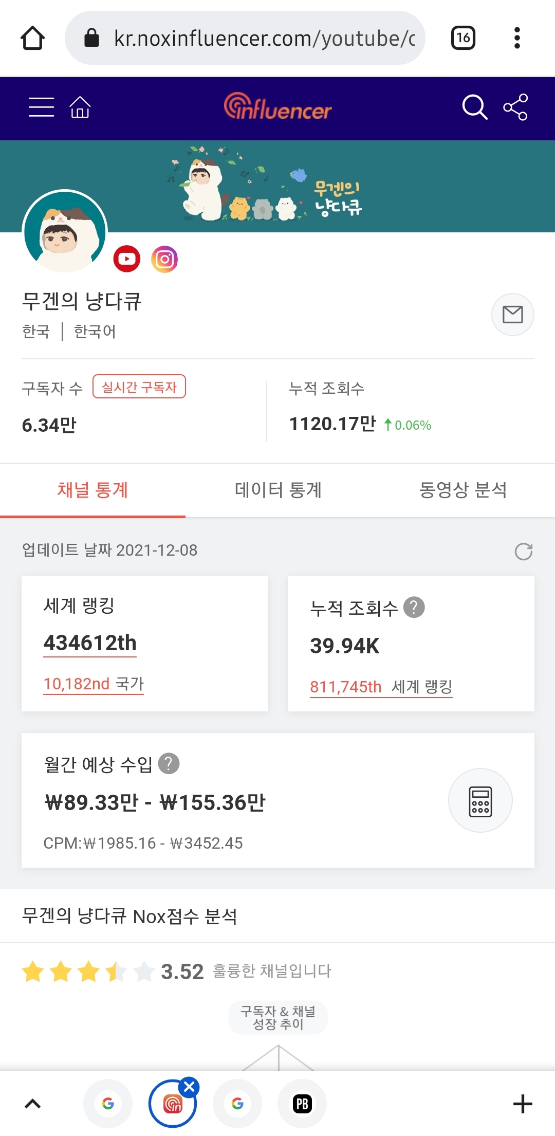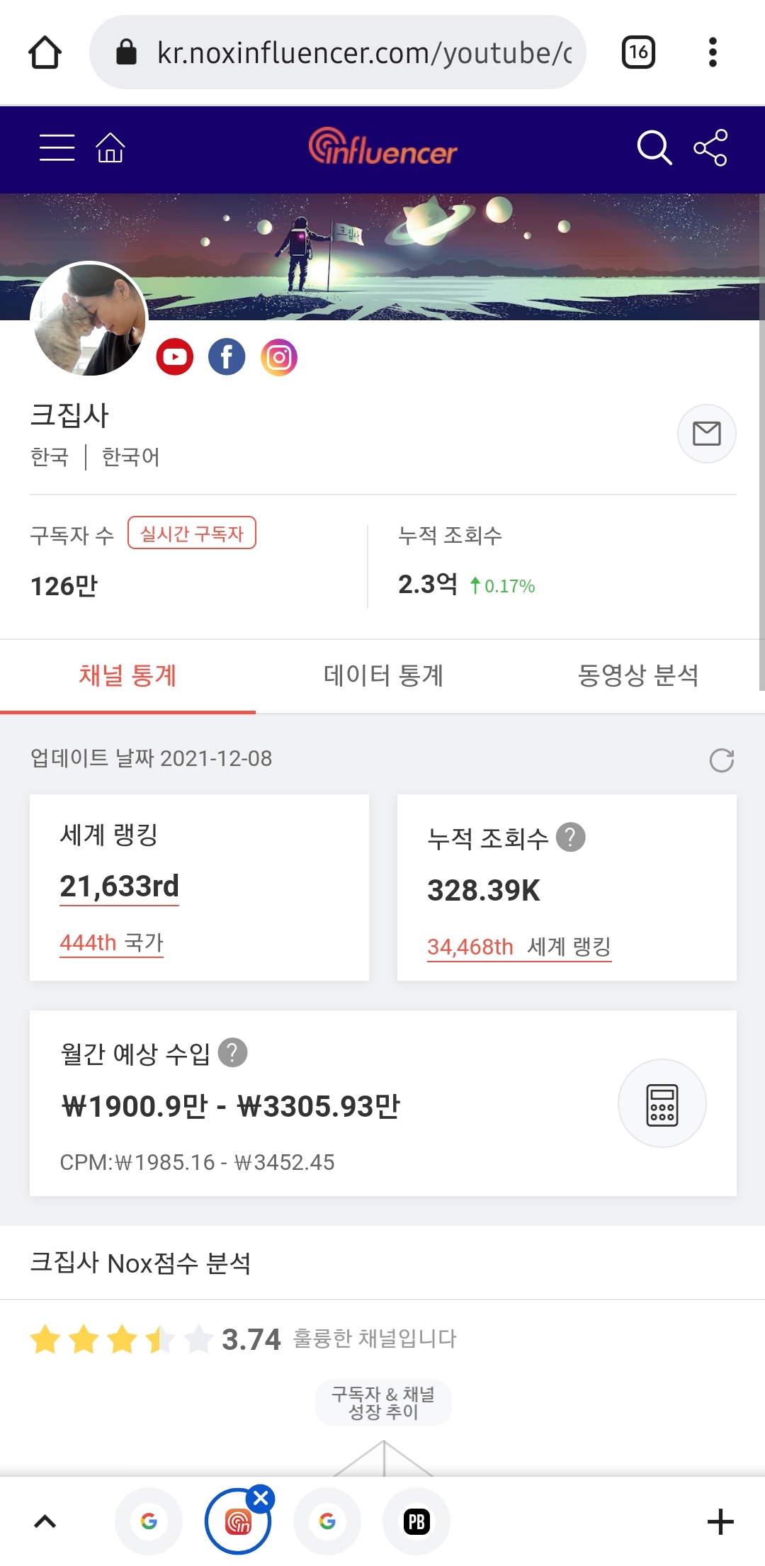 -> 슈퍼챗 금액은 높은 편이지만 월 광고수익은 상대적으로 적은 편이긔 (구독자 비 조회수가 낮은편) 보통 업계에선 이정도 월수입을 전업 유튜버의 마지노선으로 본다 하긔..
