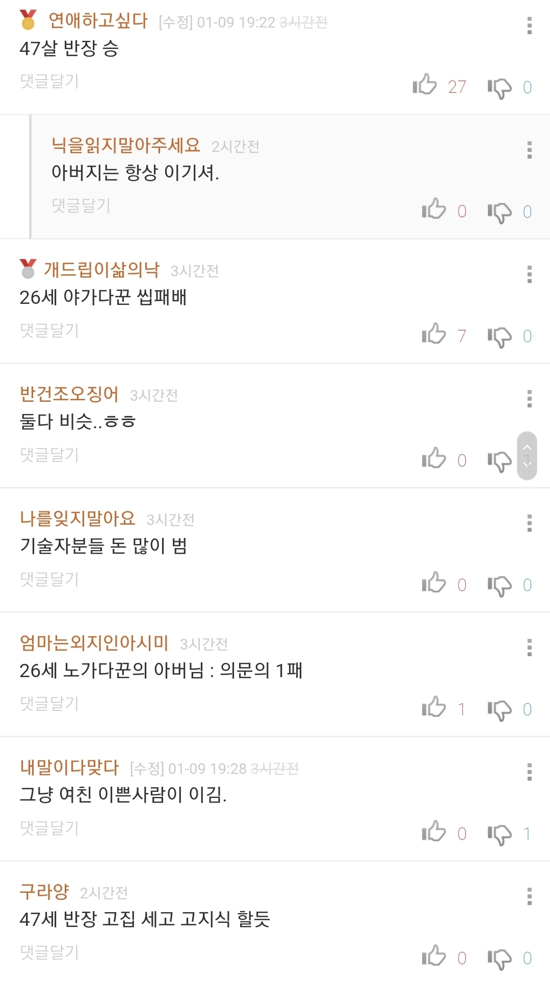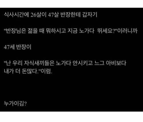 26살은 여친 못 사귀고 47살 반장님은 자식까지 있으니 47살 반장님이 이긴거지^^ -