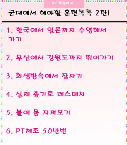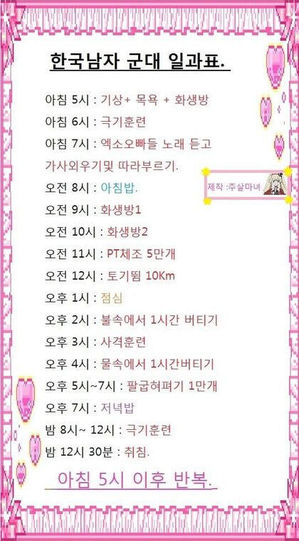 [스크랩] [흥미돋]군대에서 해야할 군대 일과표.jpg 작성자112288|작성시간22.01.12|조회수3,804 목록 댓글 17 글자크기 작게가 글자크기 크게가 출처 : 여성시대 그린티라떼샷추가오후 2시에 전부 다 죽었겠는데 ㅋㅋㅋㅋㅋㅋㅋㅋㅋㅋㅋㅋㅋ 시밬ㅋㅋㅋㅋㅋ 다음검색 스크랩 원문 : *여성시대* 차분한 20대들의 알흠다운 공간 현재 게시글 추가 기능 열기 북마크 공유하기 신고 센터로 신고 댓글 댓글 17 댓글쓰기 답글쓰기 댓글 리스트 작성자앤드류야얼굴힘줘 | 작성시간 22.01.12 불속에서 1시간 버티깈ㅋㅋㅋㅋㅋ 작성자강동원 아내 | 작성시간 22.01.12 데스매치 너무 좋네요... 작성자저요 저요 | 작성시간 22.01.12 토기뜀ㅋㅋㅋ 작성자연두 | 작성시간 22.01.12 동의합니다. 작성자구름위를 달려보자 올라타 | 작성시간 22.01.12 밥은 꼬박꼬박 주는게 ㅈㄴ 웃겨 주는 의미가 없어 ㅋㅌㅌㅌㅋㅋ 아침먹고 다 죽을듯 댓글 전체보기