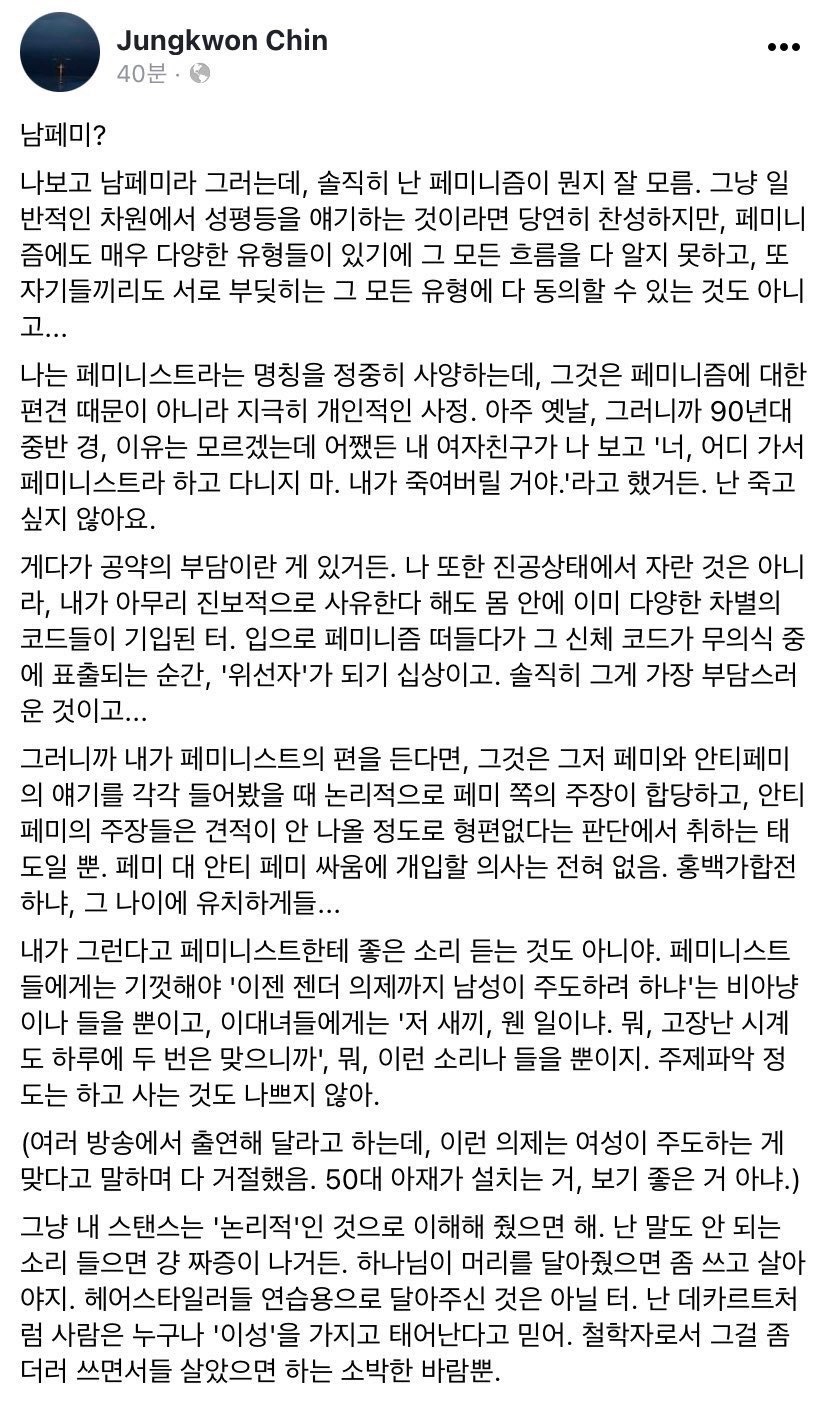작성자고양ㅇI 작성시간 22.01.14 대박 남자가 페미 관련으로 글 썼는데 거슬리는 문장이 하나도 없누...