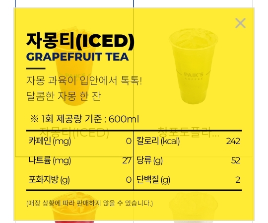 자몽티 당류 52g 자몽이 쓴 과일이라 시럽을 더 많이 넣는지 유독 자몽들어가면 당이 더 높음