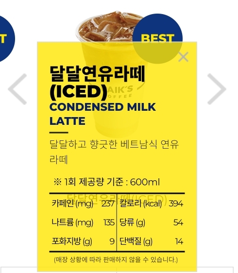 달달 연유라떼는 이름에 걸맞게 당류 54g