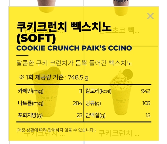빽다방에서 당류가 가장 높은 쿠키크런치 빽스치노 당류 103g..