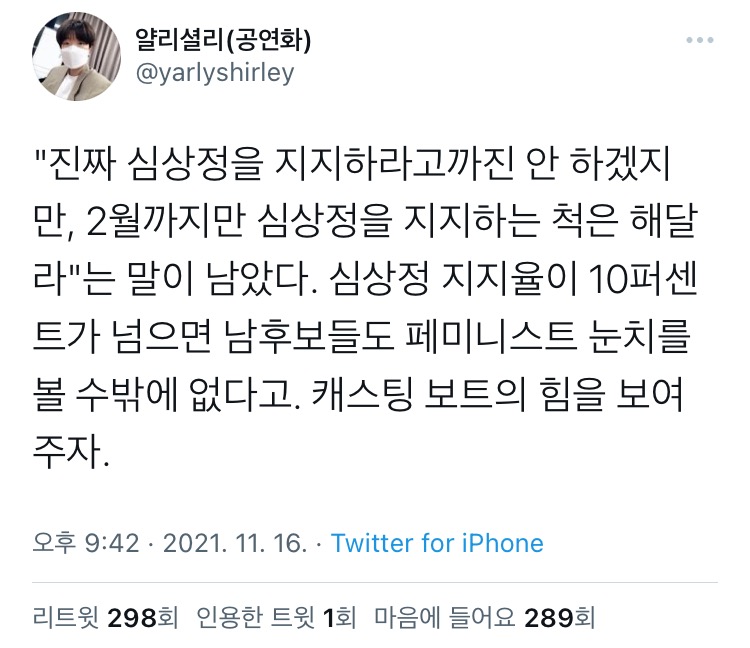 +++혹시나 댓글보니 오해하는 여새들 있는 것 같아 추가! 이분은 당연히 심지지자인데 지지자 아니라도 지지자인 척 해야 여성한테 이득이라는 말을 하는 것 같아