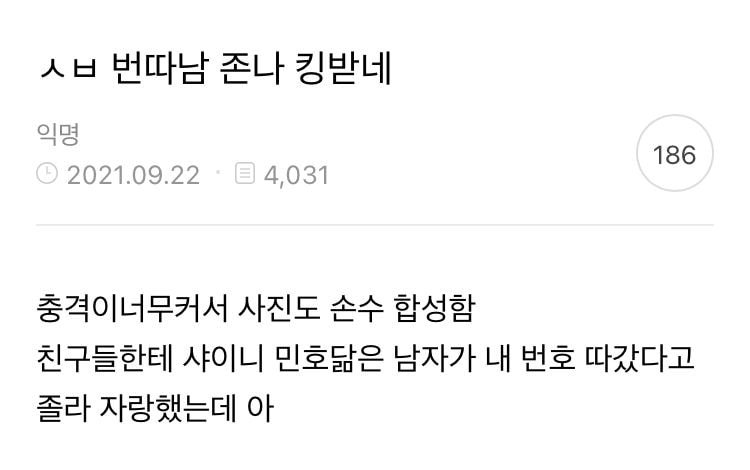 [스크랩] [흥미돋]ㅅㅂ 번따남 존나 킹받네 작성자밤하늘의 반짝이는|작성시간22.01.17|조회수12,754 목록 댓글 24 글자크기 작게가 글자크기 크게가 다음검색 스크랩 원문 : 쭉빵카페 현재 게시글 추가 기능 열기 북마크 공유하기 신고 센터로 신고 댓글 댓글 24 댓글쓰기 답글쓰기 댓글 리스트 작성자푸른하늘푸른바다 | 작성시간 22.01.17 이게 가능한일이었냐곸ㅌㅌㅋㅋㅋㅌㅋㅋㅋ 작성자블랙소르벵 | 작성시간 22.01.17 ㅁㅊ.... 작성자꼬카콜라제료 | 작성시간 22.01.17 앜ㅋㄱㄱㄱㅋㄱㄱㄱㅋㅋ 작성자다복빔맞은여시 | 작성시간 22.01.17 아 존나 웃곀ㅋ ㅋ ㅋㅋ ㅋㅋㅋㅋㅋㅋㅋㅋㅋㅋㅋㅋㅋㅋㅋㅋㅋ합성 미쳤냐고 작성자매운새우깡! | 작성시간 22.01.23 합성개잘함 ㅋㅋㅋㅋㅋㅋㅋㅋㅋㅋㅋ 댓글 전체보기