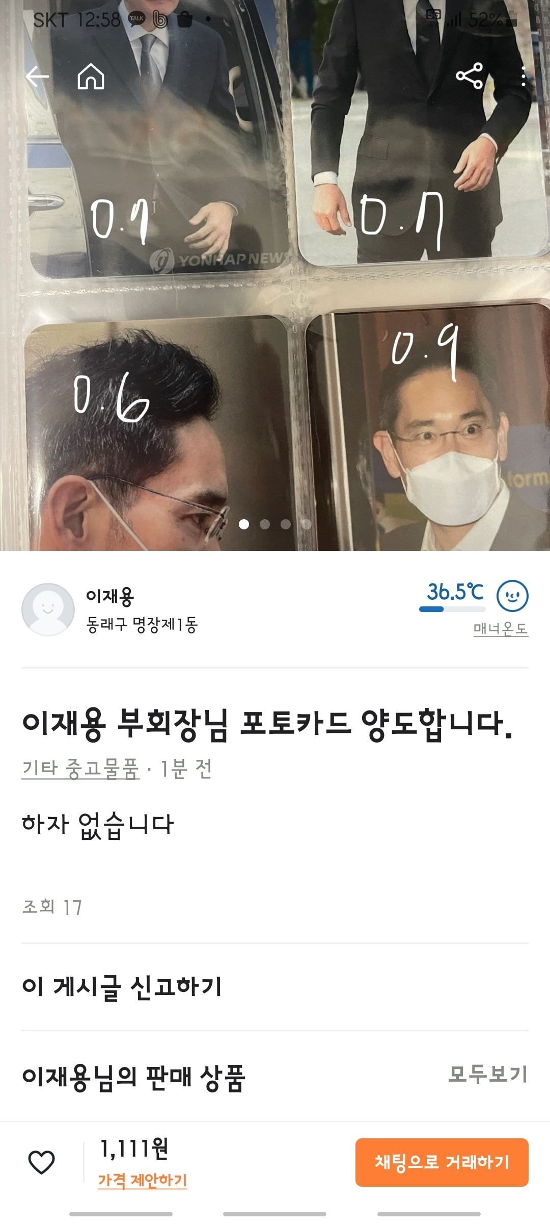 [스크랩] [흥미돋]당근마켓에 올라온 저세상 포카.JPG 작성자예둥이|작성시간22.01.27|조회수17,086 목록 댓글 62 글자크기 작게가 글자크기 크게가 다음검색 스크랩 원문 : 도탁스 (DOTAX) 현재 게시글 추가 기능 열기 북마크 공유하기 신고 센터로 신고 댓글 댓글 62 댓글쓰기 답글쓰기 댓글 리스트 작성자박준우 | 작성시간 22.01.27 누가 사죠?ㅋㅋㅋㅋㅋ 작성자추운날엔핫초코 | 작성시간 22.01.27 왜..? 작성자지출품의서 | 작성시간 22.01.27 삼성에서 낸 공식포카 아니잖아요~~~!!! 비공식을 누가 저렇게 비싸게 사나요~~~!!!!! 작성자eaeon | 작성시간 22.01.27 희귀포카 있는 것처럼 값 다른거 킹받네ㅡㅡ 작성자ㅈㅈㅈ진수맛궁금해허니 | 작성시간 22.01.29 60원 90원인건가 댓글 전체보기