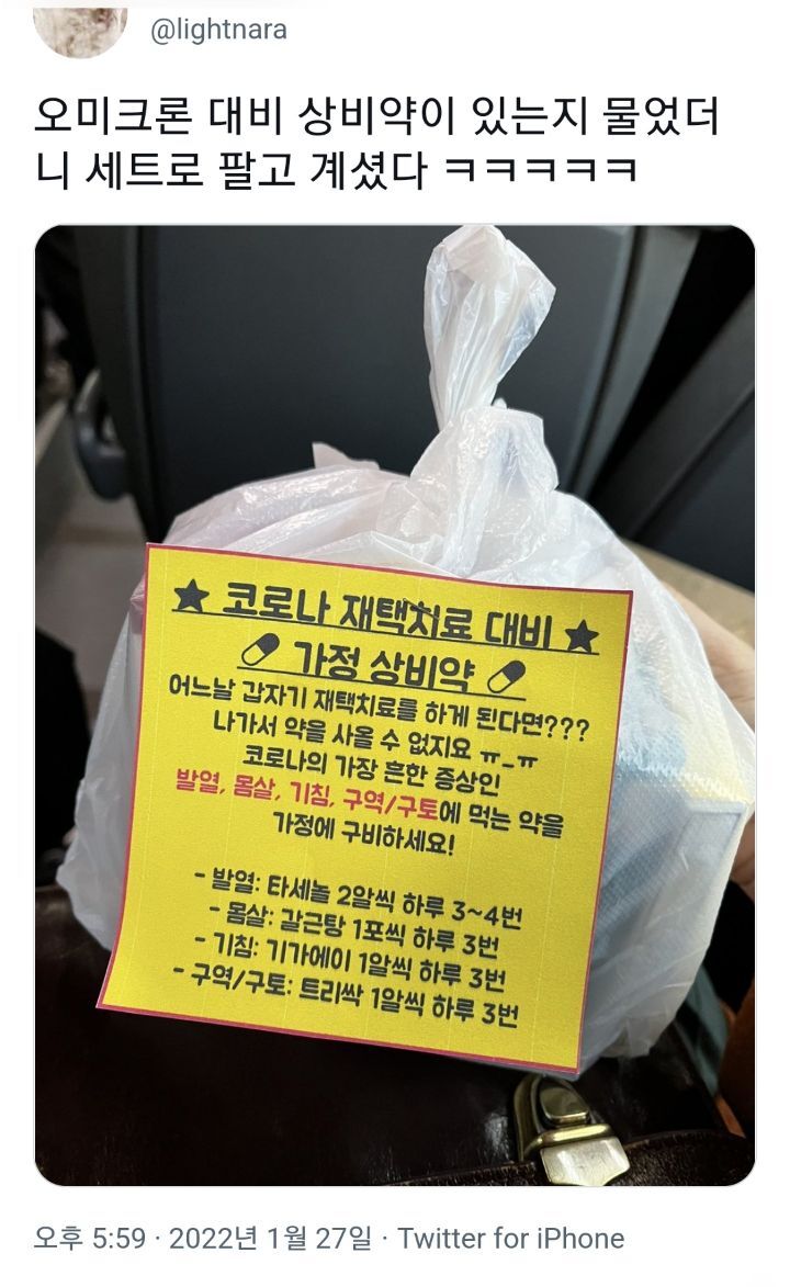 작성자산불됴심됴심 작성시간 22.01.29 근데 재택치료하면 약도 자기가 알아서 사먹는 거야??