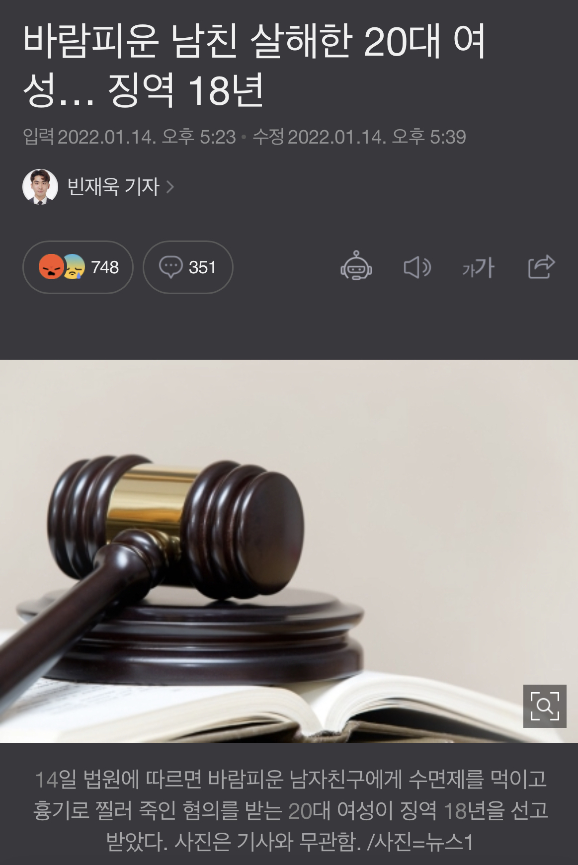 [여시뉴스데스크]바람피운 남친 살해한 20대 여성… 징역 18년 작성자이거상황극인가요|작성시간22.01.29|조회수31,544 목록 댓글 689 글자크기 작게가 글자크기 크게가 출처 : https://n.news.naver.com/article/417/0000775758전문 출처로 다음검색 현재 게시글 추가 기능 열기 북마크 공유하기 신고 센터로 신고 댓글 댓글 689 댓글쓰기 답글쓰기 댓글 리스트 작성자quincy | 작성시간 22.01.31 ????도라ㅛ나?? 작성자식탐아제발재기해ㅠ | 작성시간 22.02.01 ㅅㅂ 화딱지나서 댓글달고옴 작성자2304 | 작성시간 22.02.01 ? 작성자걸어가 결국 난 빛나리 | 작성시간 22.02.01 와 ㅅㅂ 작성자호롤롤로할머늬 | 작성시간 22.02.03 진짜로????성별이 반대가 되면 이런다고??ㅠ 미친거아냐 댓글 전체보기