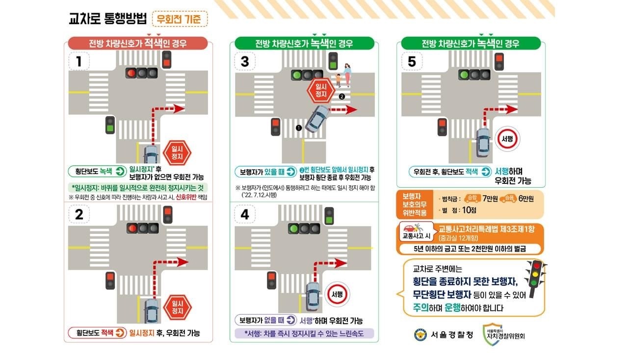 보통 직우 같은 차선인데 직진신호 뜨면 우회전 횡단보도는 또 파란불인 경우가 많음 주의해서 가라고 되있어 지금도