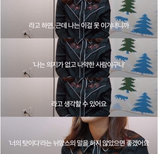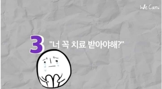 "그럼 뭔 말을 해?" 하는데..만약 암환자나 당뇨병 환자였어도 그렇게 쉽게 말했을까 싶어 물론 그런 생각 드는거 이해는 하는데 굳이 이렇게 쉽게 입밖으로 꺼내는거 자체가 우울증 환자에 대한..이해도 없이 말한게 아닐까 싶고 우울감과 우울"증"은 다른건데 여시가 말해준대로 1번은 좀 조심스러운 말이라는거에 동감해ㅠ(누구에게는 오히려 위로가 됐을 수 있지 하지만 여시가 말한 맥락에 전적으로 동의하는바) -