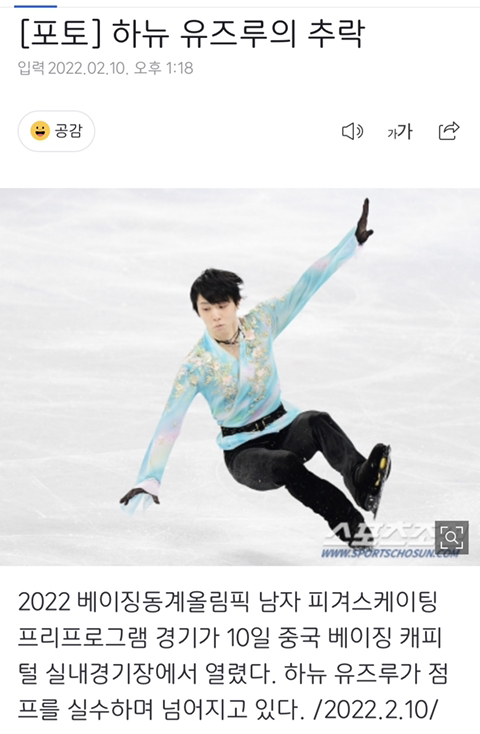 [여시뉴스데스크][포토] 하뉴 유즈루의 추락 작성자느개비는따개비|작성시간22.02.10|조회수21,894 목록 댓글 53 글자크기 작게가 글자크기 크게가 출처 : https://n.news.naver.com/sports/general/article/076/0003830526[포토] 하뉴 유즈루의 추락2022 베이징동계올림픽 남자 피겨스케이팅 프리프로그램 경기가 10일 중국 베이징 캐피털 실내경기장에서 열렸다. 하뉴 유즈루가 점프를 실수하며 넘어지고 있다. /2022.2.10/▶2022 임인년 신년운세n.news.naver.com 다음검색 현재 게시글 추가 기능 열기 북마크 공유하기 신고 센터로 신고 댓글 댓글 53 댓글쓰기 답글쓰기 댓글 리스트 작성자비오는날집에서 | 작성시간 22.02.10 왜 1위야 ㅡㅡ 작성자건물주됨 | 작성시간 22.02.10 …? 1위라고? 작성자뙤약볕 | 작성시간 22.02.10 뭔 옷도 저런 촌스러운걸 입었대 작성자Here now | 작성시간 22.02.10 박수칠때 떠나지 왜 나온겨?? 작성자옷깃을 여며주면 사랑 | 작성시간 22.02.10 옷도 지같은거 처입고 어우 꼴뵈기싫어 댓글 전체보기