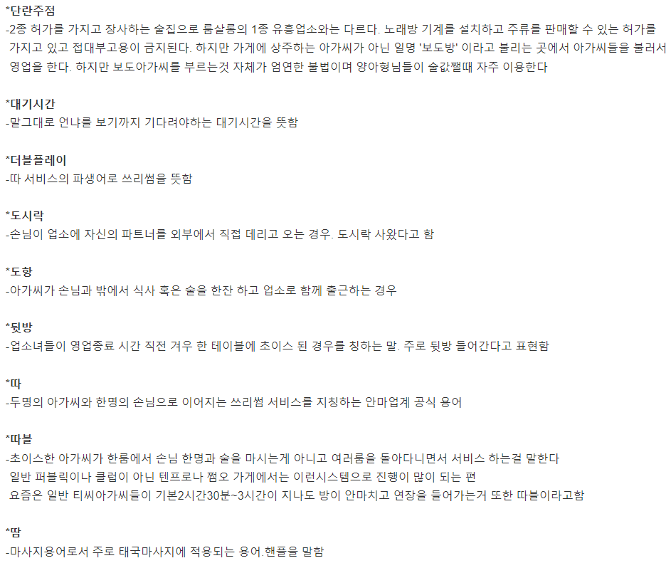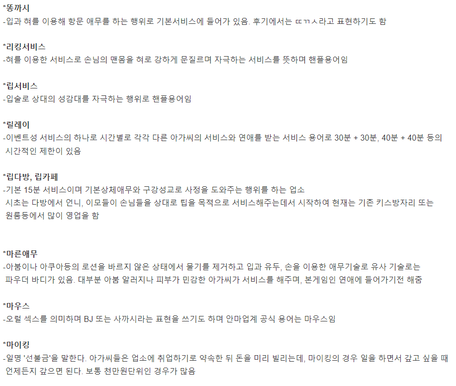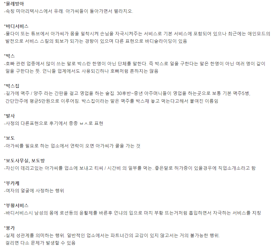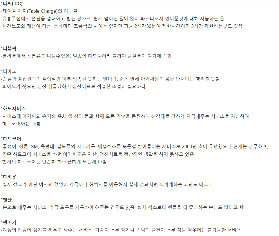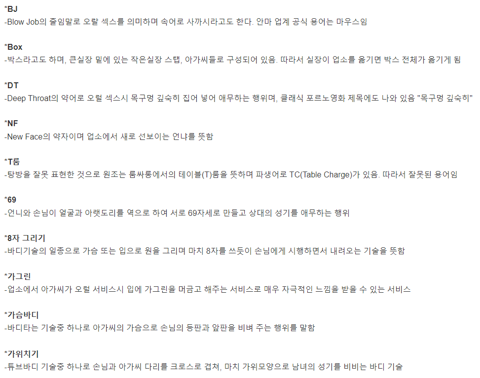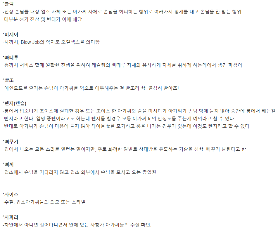 [씹빨쌔끼뜰]유흥(성매매, 건마, 스웨디시등등...)에서 쓰이는 용어 정리 작성자아침엔아침밥점심엔|작성시간22.02.11|조회수24,189 목록 댓글 21 글자크기 작게가 글자크기 크게가 출처 : 여성시대 (아침엔아침밥점심엔) 알고싶진 않았지만 알게되어버렸으니공유합니다. 내 남친이, 내 동생이 그런곳에 가는지 확인할 수 있도록 잘 익혀둡시다. 이상입니다. -----문제시 글삭제하겠습니다.---- 다음검색 현재 게시글 추가 기능 열기 북마크 공유하기 신고 센터로 신고 댓글 댓글 21 댓글쓰기 답글쓰기 댓글 리스트 작성자보석썬그리어때여..? | 작성시간 22.02.11 헉 드릅다ㅡㅡ 이눔의식히들 작성자고암이 | 작성시간 22.02.16 으 작성자뮤자크 | 작성시간 22.03.20 더러워;; 작성자다람다람잉 | 작성시간 22.10.23 ..ㅋ 작성자송강송강공 | 작성시간 23.09.29 ㅋㅋ사전ㅋㅋㅋㅋㅋㅋ 댓글 전체보기