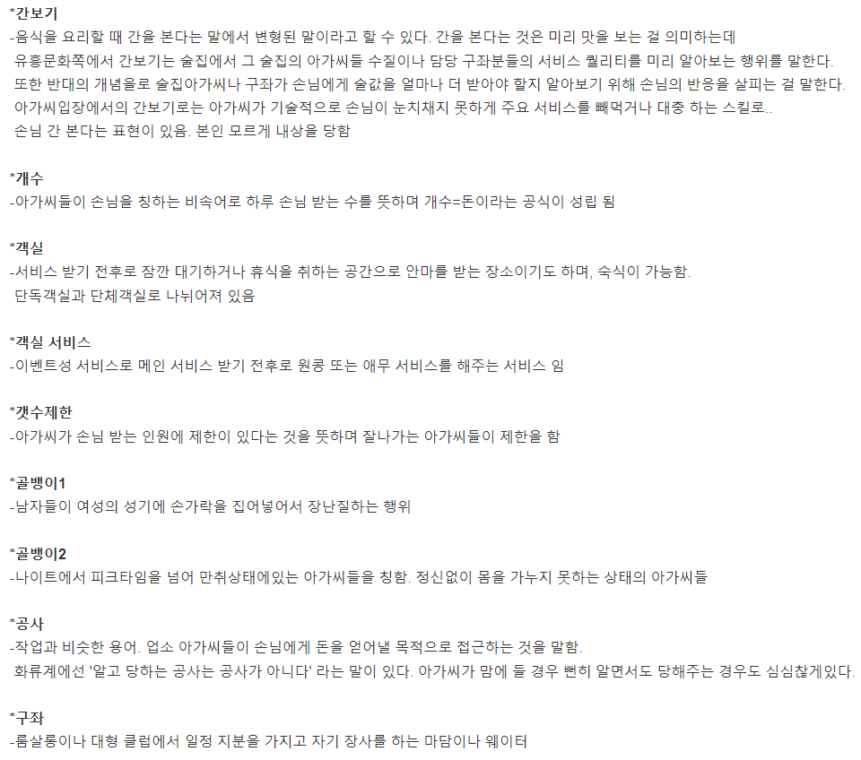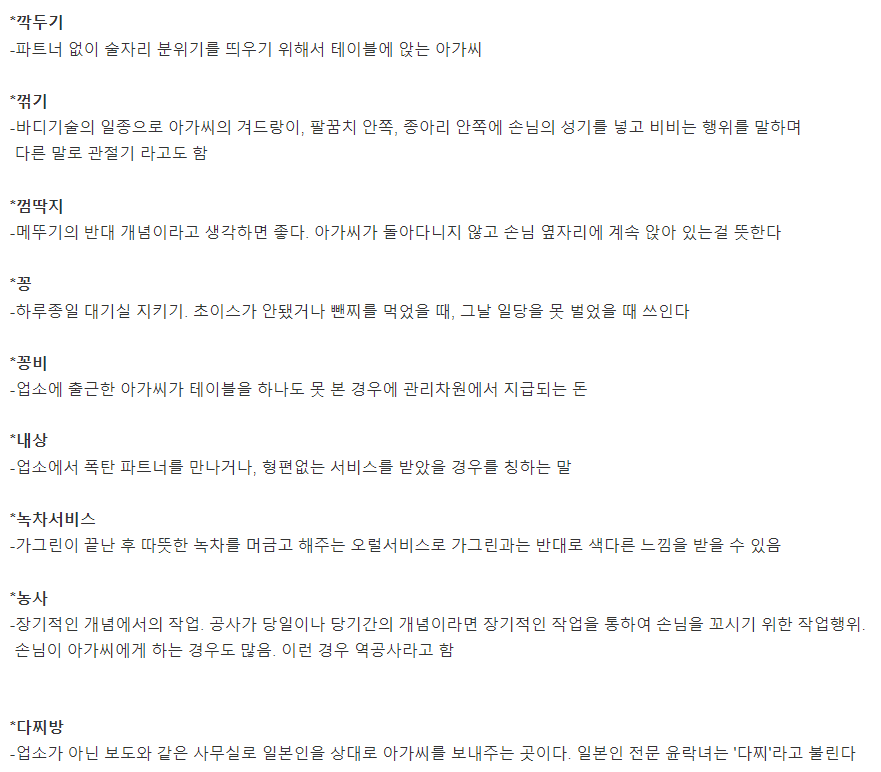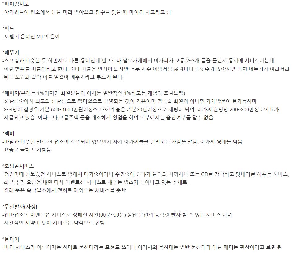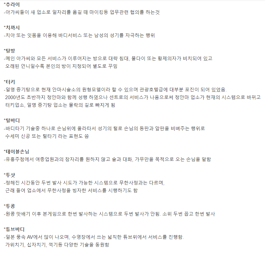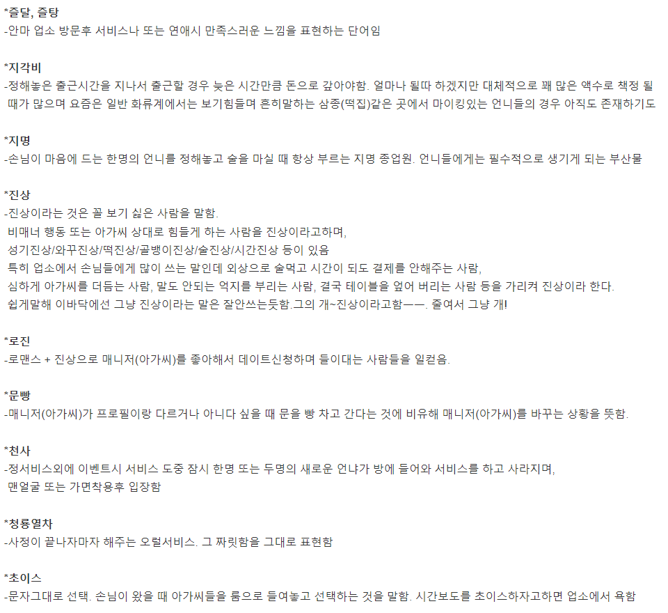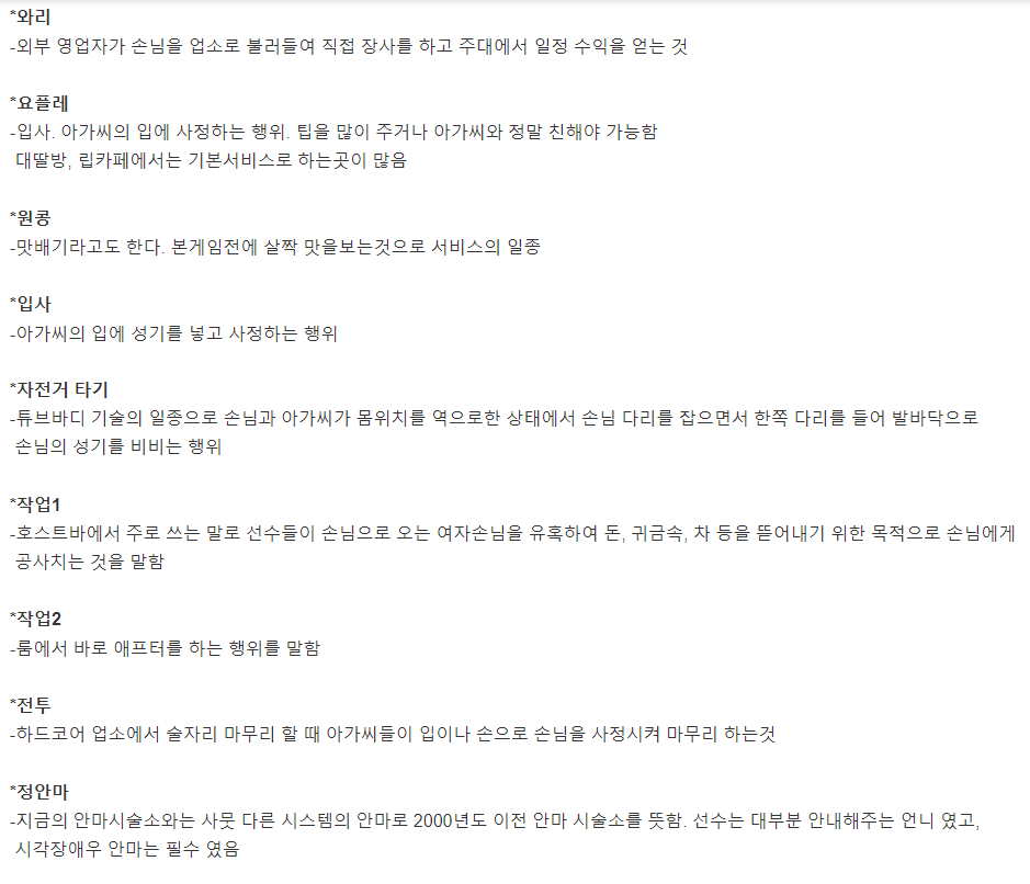 [씹빨쌔끼뜰]유흥(성매매, 건마, 스웨디시등등...)에서 쓰이는 용어 정리 작성자아침엔아침밥점심엔|작성시간22.02.11|조회수24,189 목록 댓글 21 글자크기 작게가 글자크기 크게가 출처 : 여성시대 (아침엔아침밥점심엔) 알고싶진 않았지만 알게되어버렸으니공유합니다. 내 남친이, 내 동생이 그런곳에 가는지 확인할 수 있도록 잘 익혀둡시다. 이상입니다. -----문제시 글삭제하겠습니다.---- 다음검색 현재 게시글 추가 기능 열기 북마크 공유하기 신고 센터로 신고 댓글 댓글 21 댓글쓰기 답글쓰기 댓글 리스트 작성자보석썬그리어때여..? | 작성시간 22.02.11 헉 드릅다ㅡㅡ 이눔의식히들 작성자고암이 | 작성시간 22.02.16 으 작성자뮤자크 | 작성시간 22.03.20 더러워;; 작성자다람다람잉 | 작성시간 22.10.23 ..ㅋ 작성자송강송강공 | 작성시간 23.09.29 ㅋㅋ사전ㅋㅋㅋㅋㅋㅋ 댓글 전체보기
