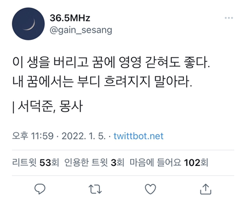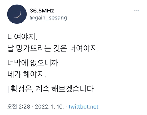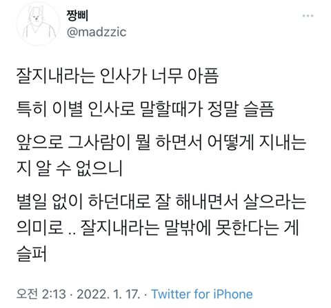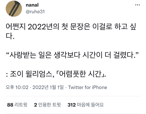 작성자내사랑모카 작성시간 22.02.13 우연히 사랑하고 반드시 헤어진다는 말이 되게 쿵하고 와닿는다..어떤 방식으로든 반드시 헤어질 수 밖에 없는 인간의 숙명이 미리 마음 아프네 ㅠㅠ