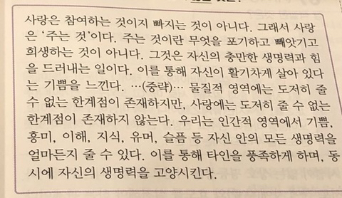 답댓글 작성자김밥오이빼고 작성시간 22.02.13 이거 에리히 프롬의 사랑의 기술에 나오는 내용이야!