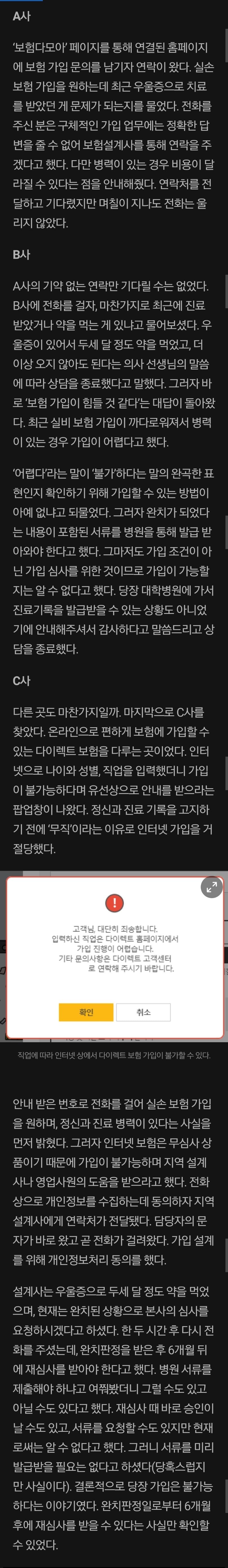 보험 관련 기사 작성하는 신문사 기자가 직접 가입 시도해본 현실임 보험 가입 했다는 헛된 희망보단 팩트를 알려주고 싶었음