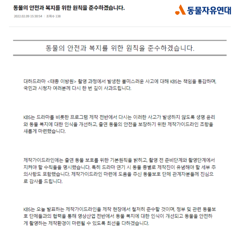지난 1월 동물자유연대가 KBS 드라마 ‘태종 이방원’ 말 학대 사건을 공론화한 이후 최근 KBS는 ‘동물출연 가이드라인’을 제정했습니다. 내용상 다소 아쉬움이 있기는 하지만 공영방송에서 처음으로 방송 촬영 시 동물 안전과 복지를 다룬 기준을 마련했다는 사실은 큰 의미가 있습니다.