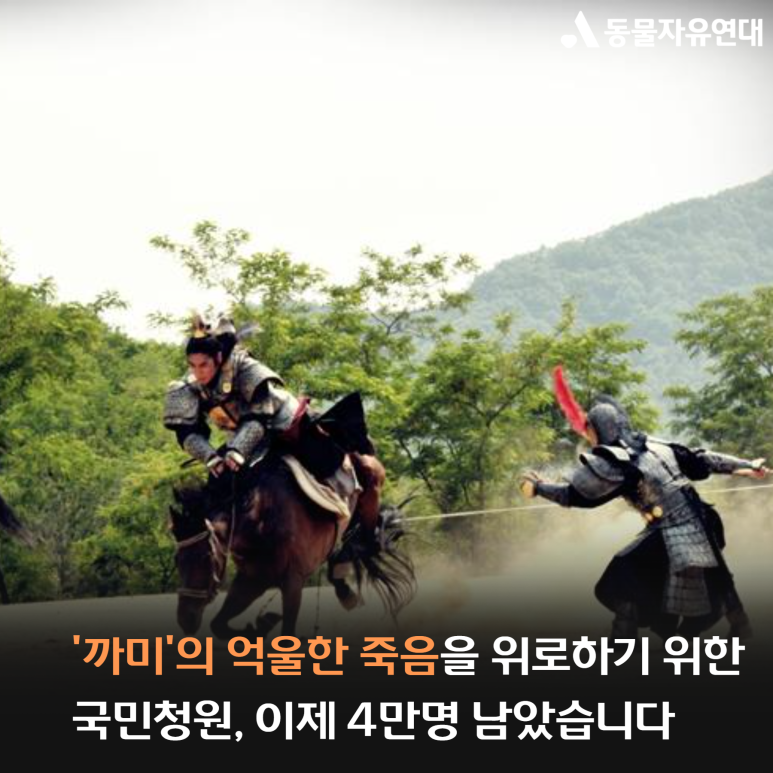 여러분, 그 동안 방송을 위해 착취당한 동물들에게 조금만 더 관심을 이어가주세요. 마방 구석에서 치료조차 받지 못하고 죽어갔을 까미와 아무에게도 알려지지 않고 고통 속에 희생되었을 동물들, 앞으로도 소품 취급 당하며 방송에 이용될 까미의 수 많은 친구들을 위해 국민 청원 20만 달성에 힘을 모아주시길 부탁드립니다.